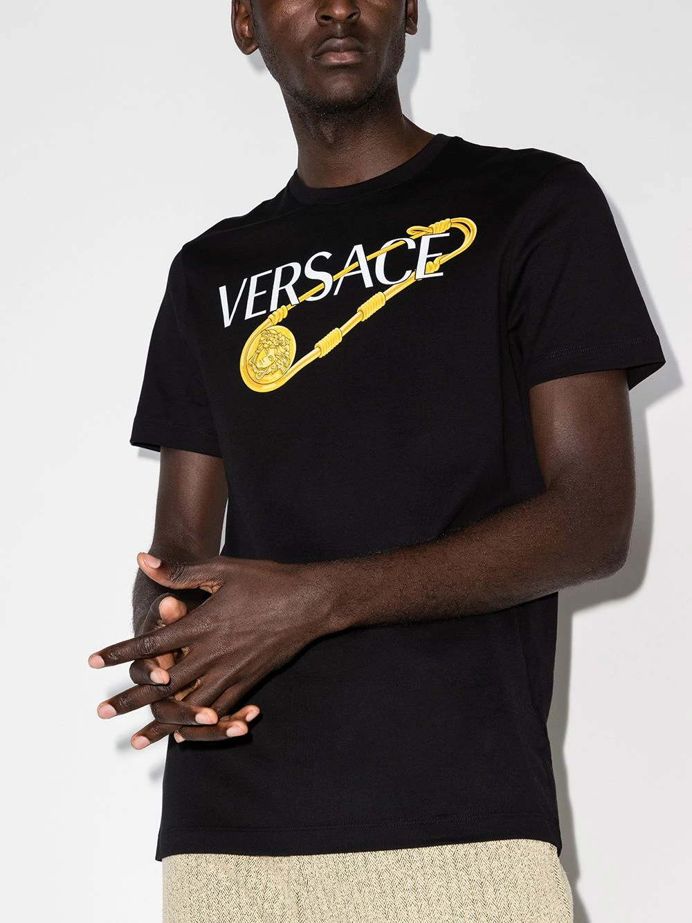 Détail d’épingle à nourrice, encolure ras du cou, manches courtes, ourlet droit. Couleur : noir. Matière : coton.