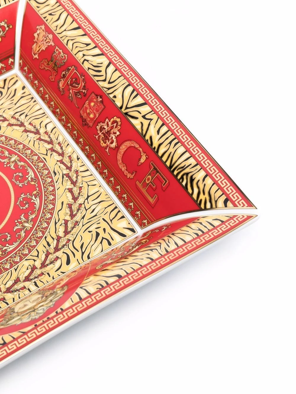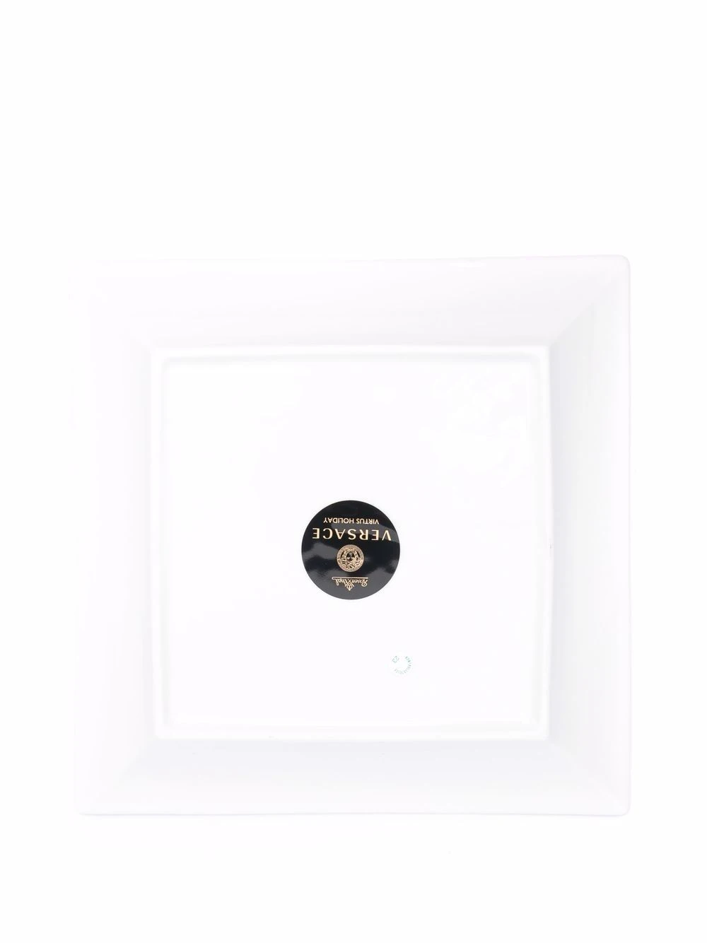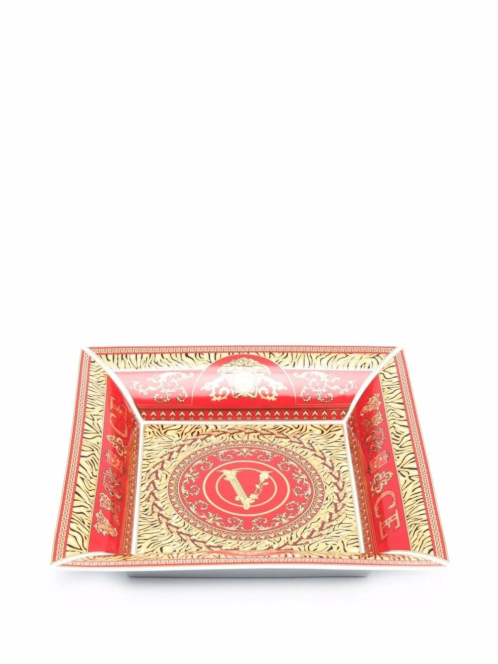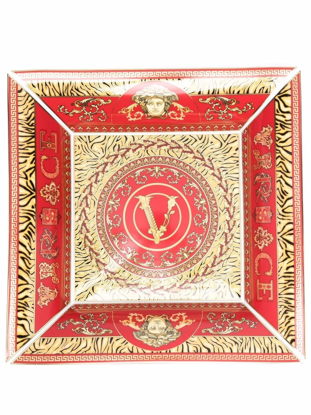 Forme carrée, forme arrondie, logo imprimé sur le côté, motif baroque. Matière : céramique.