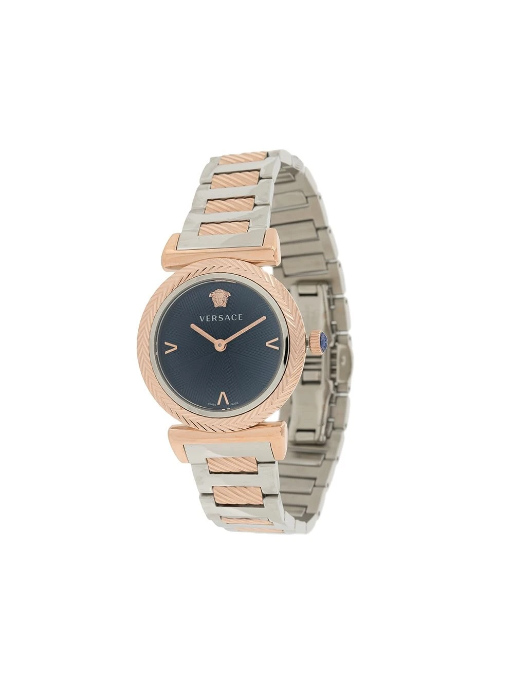 Modèle bicolore, détail Medusa, mouvement à quartz, cadran à indicateur, boîtier rond, bracelet en acier inoxydable, fermoir papillon, étanche jusqu’à 50 m/5 ATM. Matière : acier inoxydable.