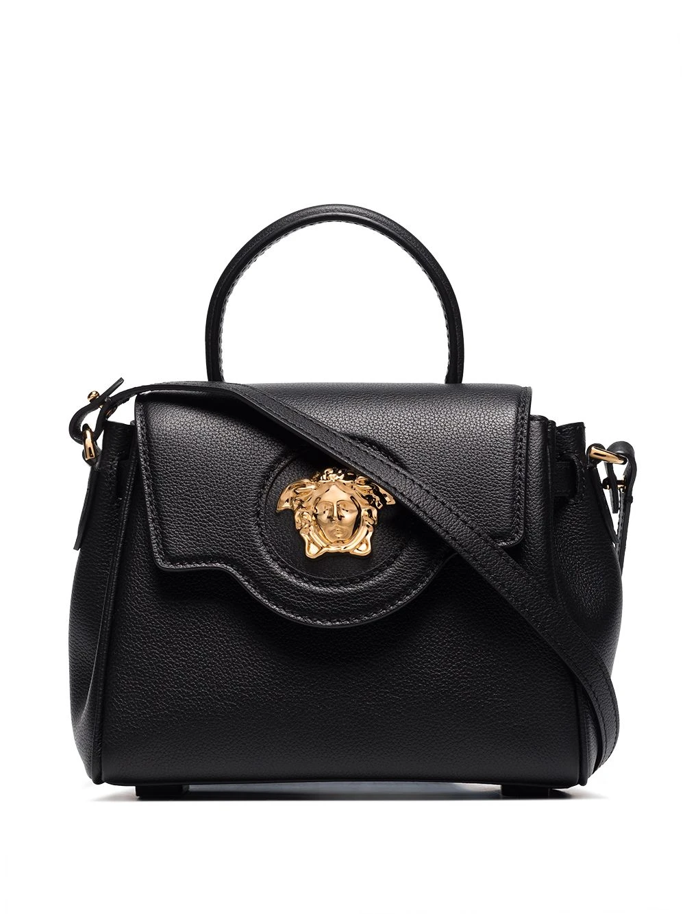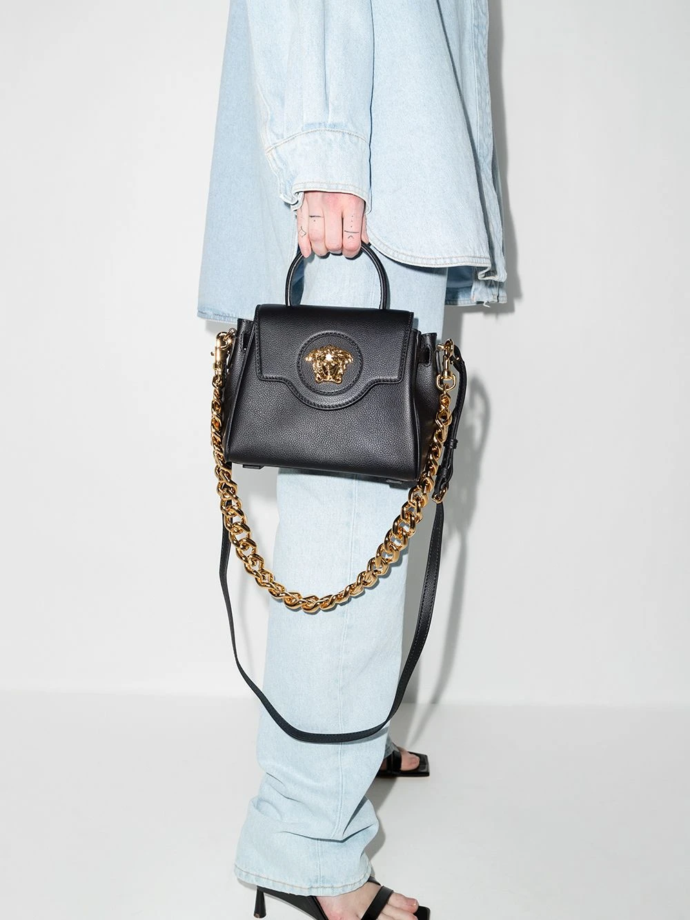 Motif Medusa, bride porté épaule détachable et ajustable, anse arrondie, rabat sur le dessus, plaque logo, bride porté épaule en chaîne. Couleur : noir. Matière : cuir.