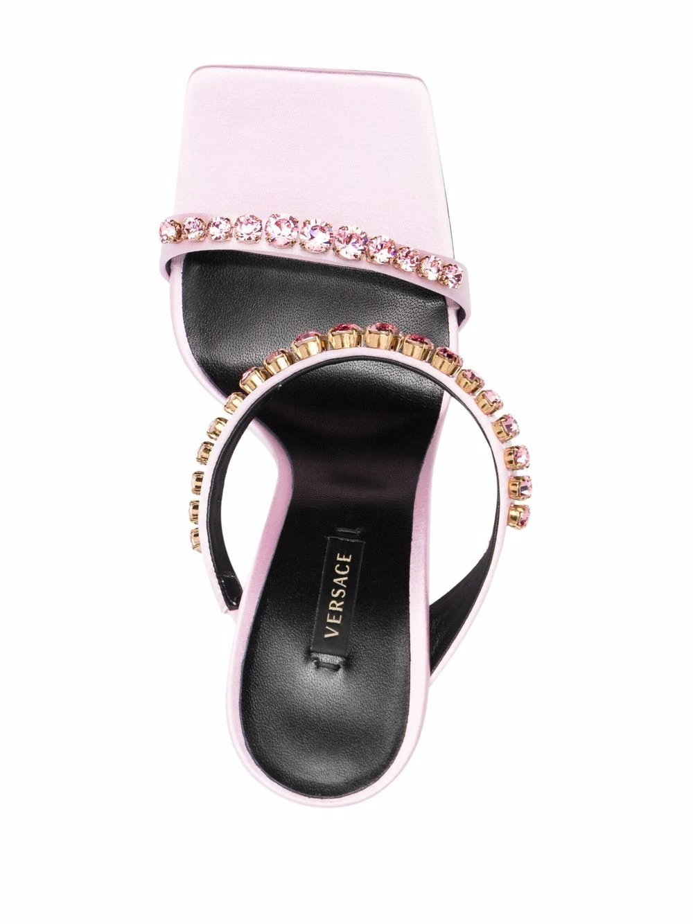 Talon haut, bout ouvert, ornement en cristal, design double-tour, bout carré. Couleur : rose. Matière : cuir.