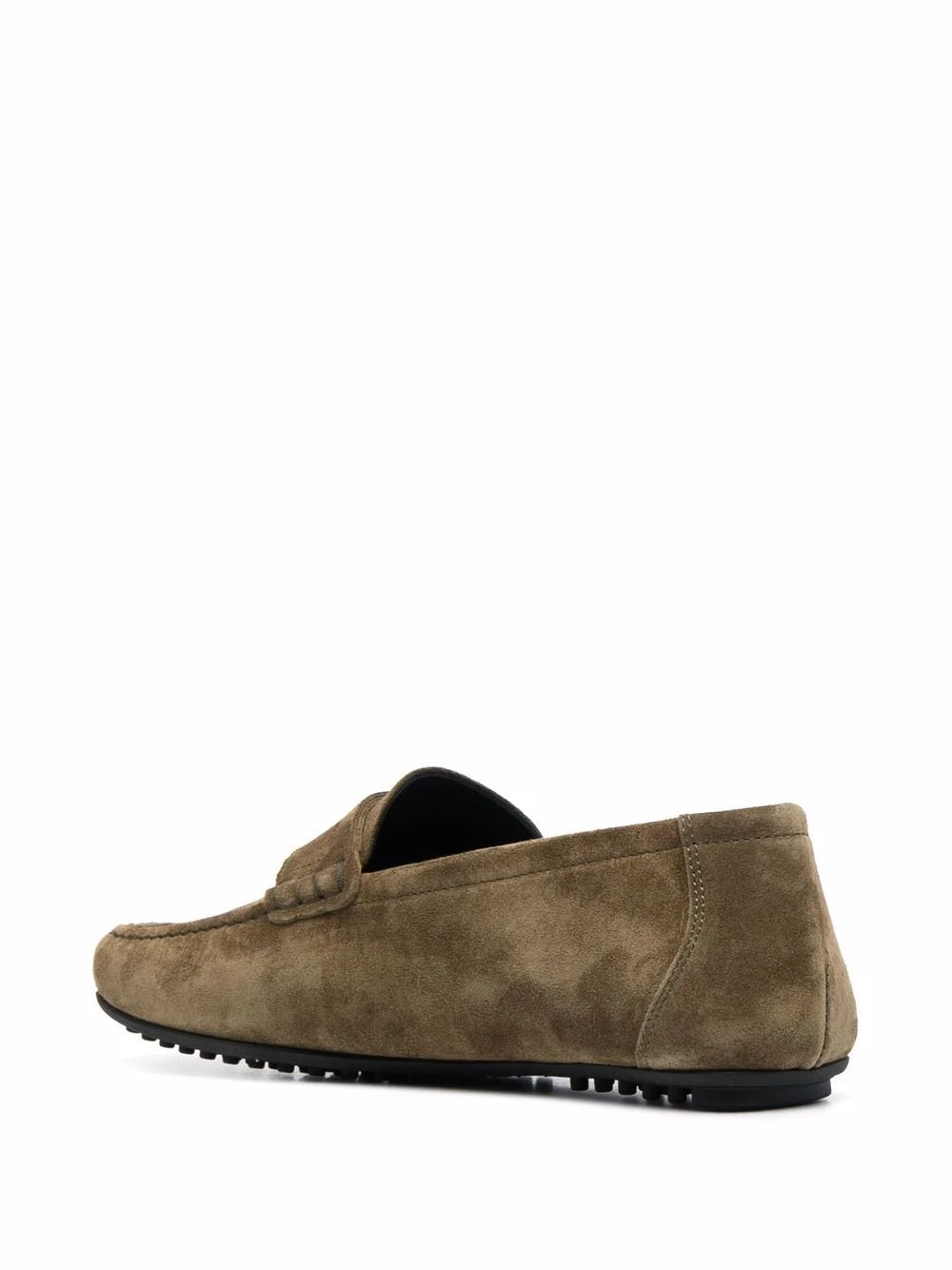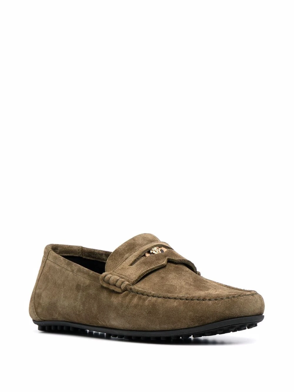 Motif Medusa, semelle intérieure à logo, bout rond, design à enfiler. Couleur : marron. Matière : daim.