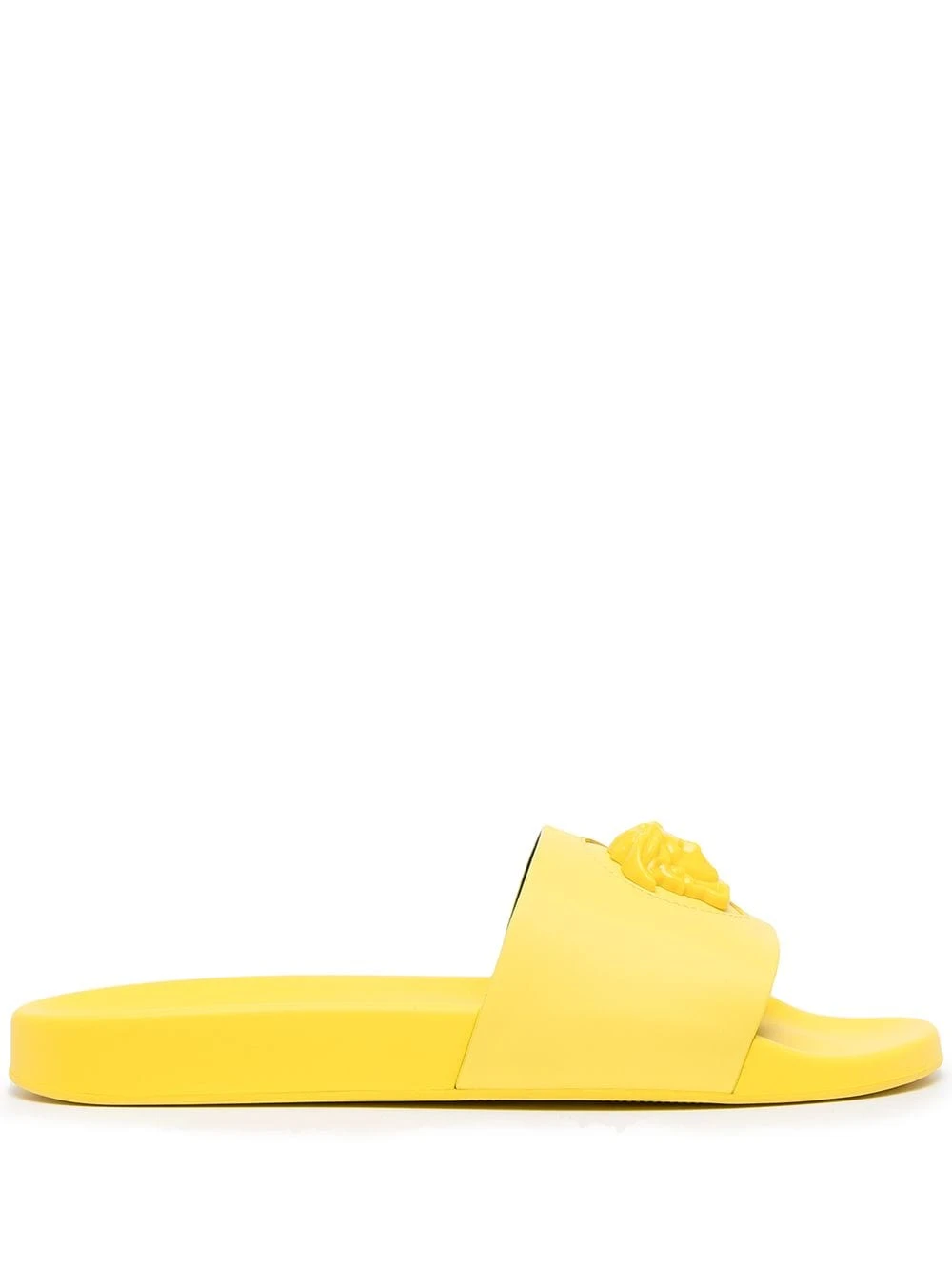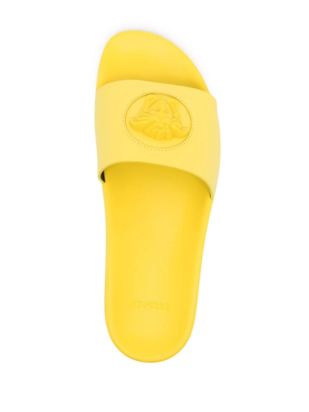 Bout ouvert, motif Medusa, semelle intérieure à logo, semelle intérieure anatomique, semelle plate en caoutchouc. Couleur : jaune. Matière : cuir.