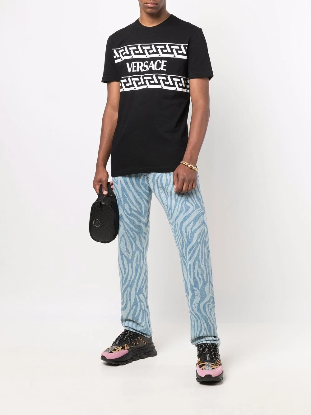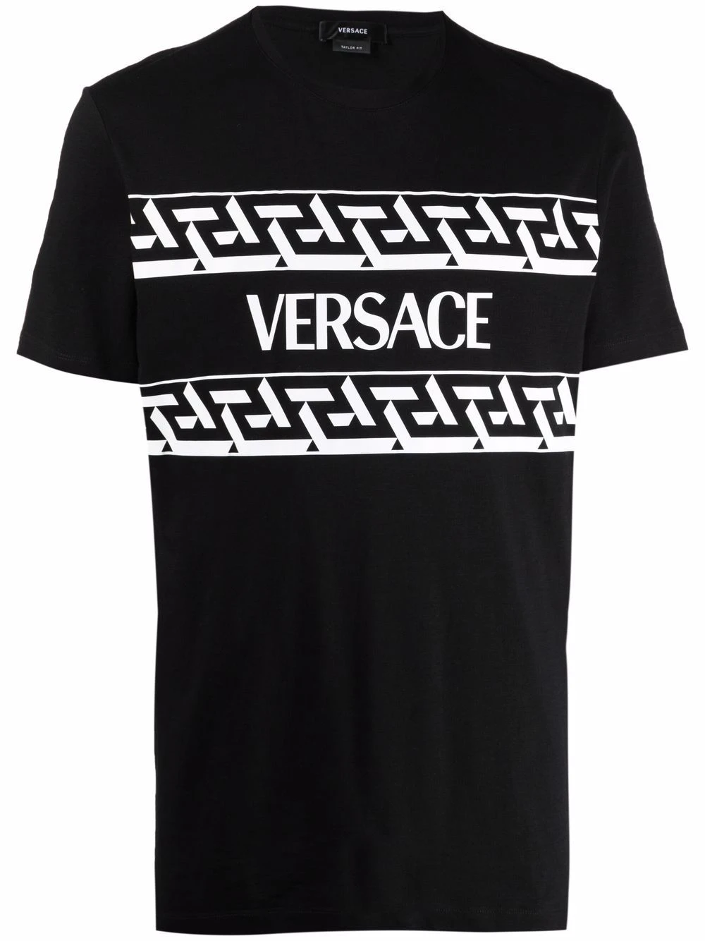Logo imprimé sur le devant, motif Greca signature imprimé, encolure ronde, manches courtes, ourlet droit. Couleur : noir. Matière : coton.