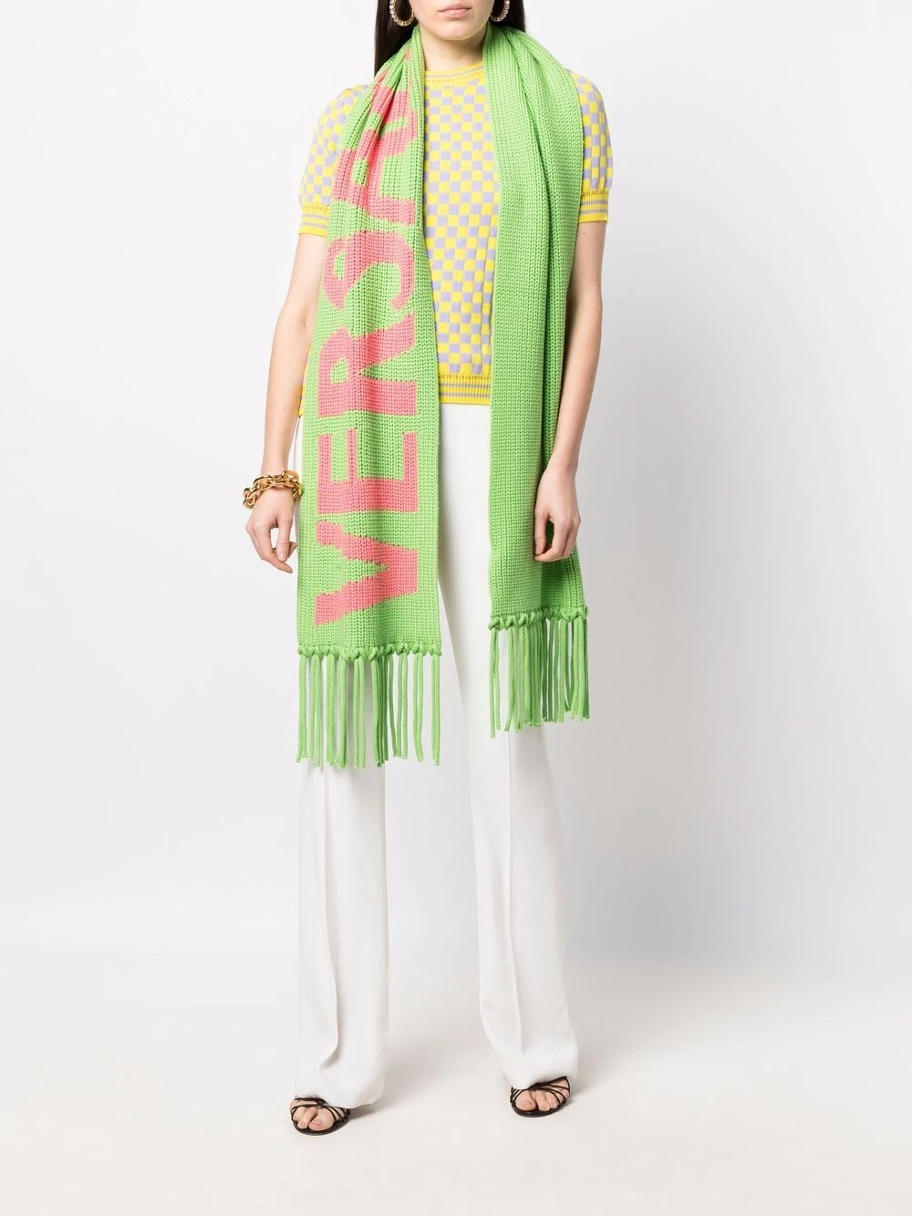 Logo intarsia, maille épaisse, bordures à pompons. Couleur : vert. Matière : laine.