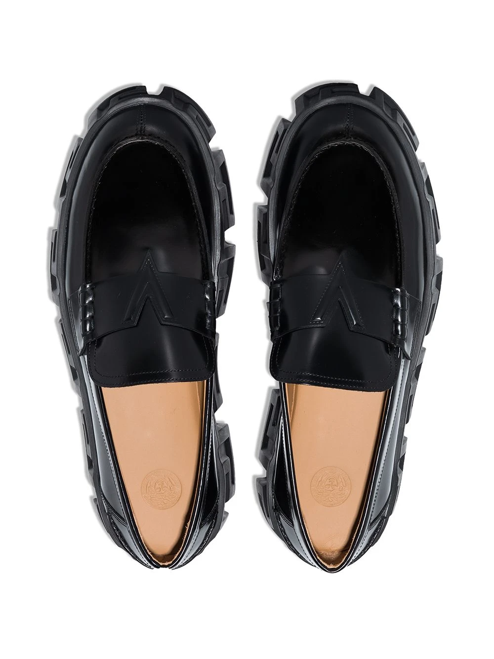 Détail Greca signature, design à enfiler, bout rond, semelle intérieure à logo. Couleur : noir. Matière : cuir.