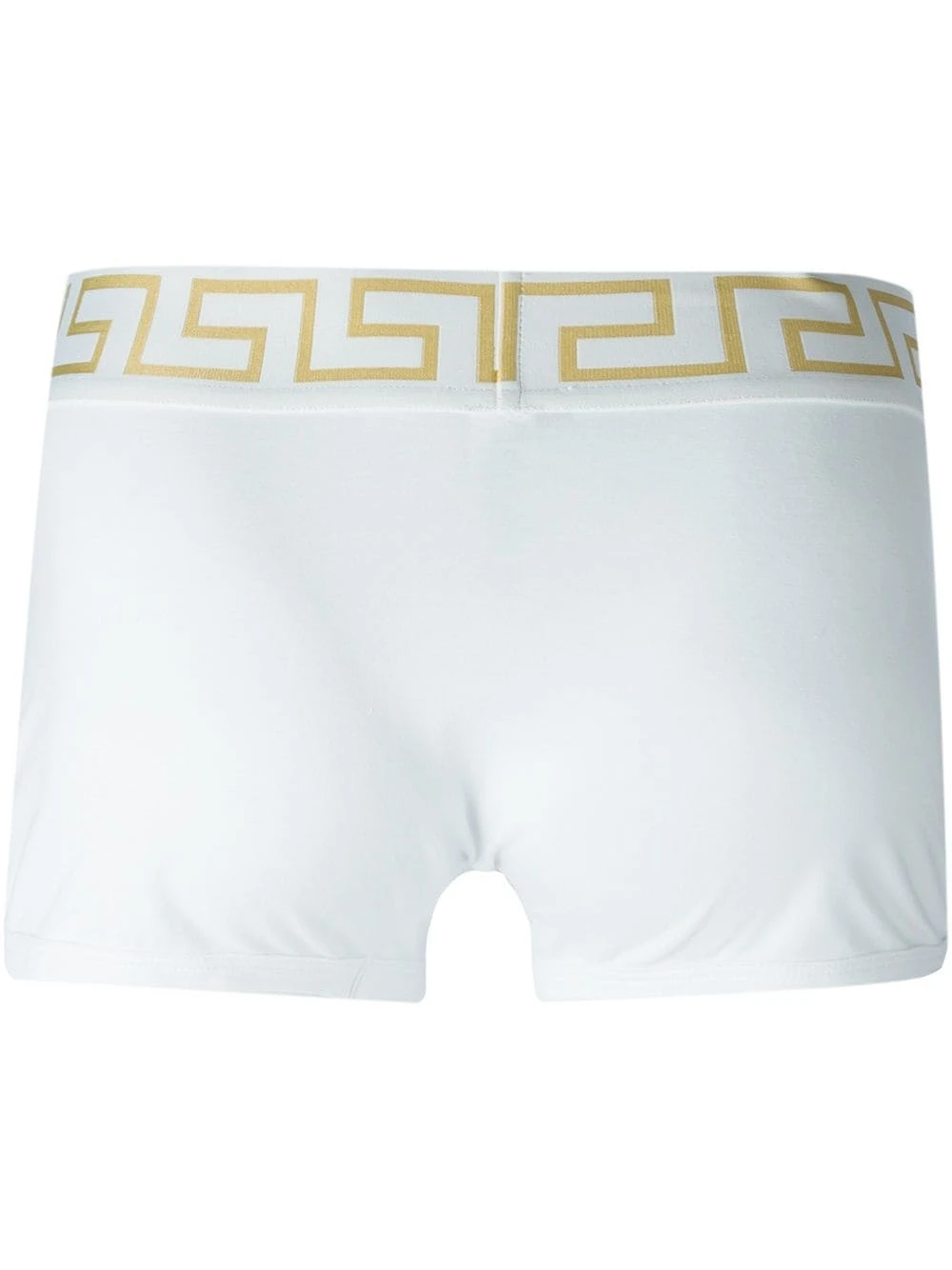 Boxer à taille élastique Greca en coton stretch blanc Versace avec bordure élastique. Les sous-vêtements et la lingerie doivent être essayés par dessus vos propres vêtements.