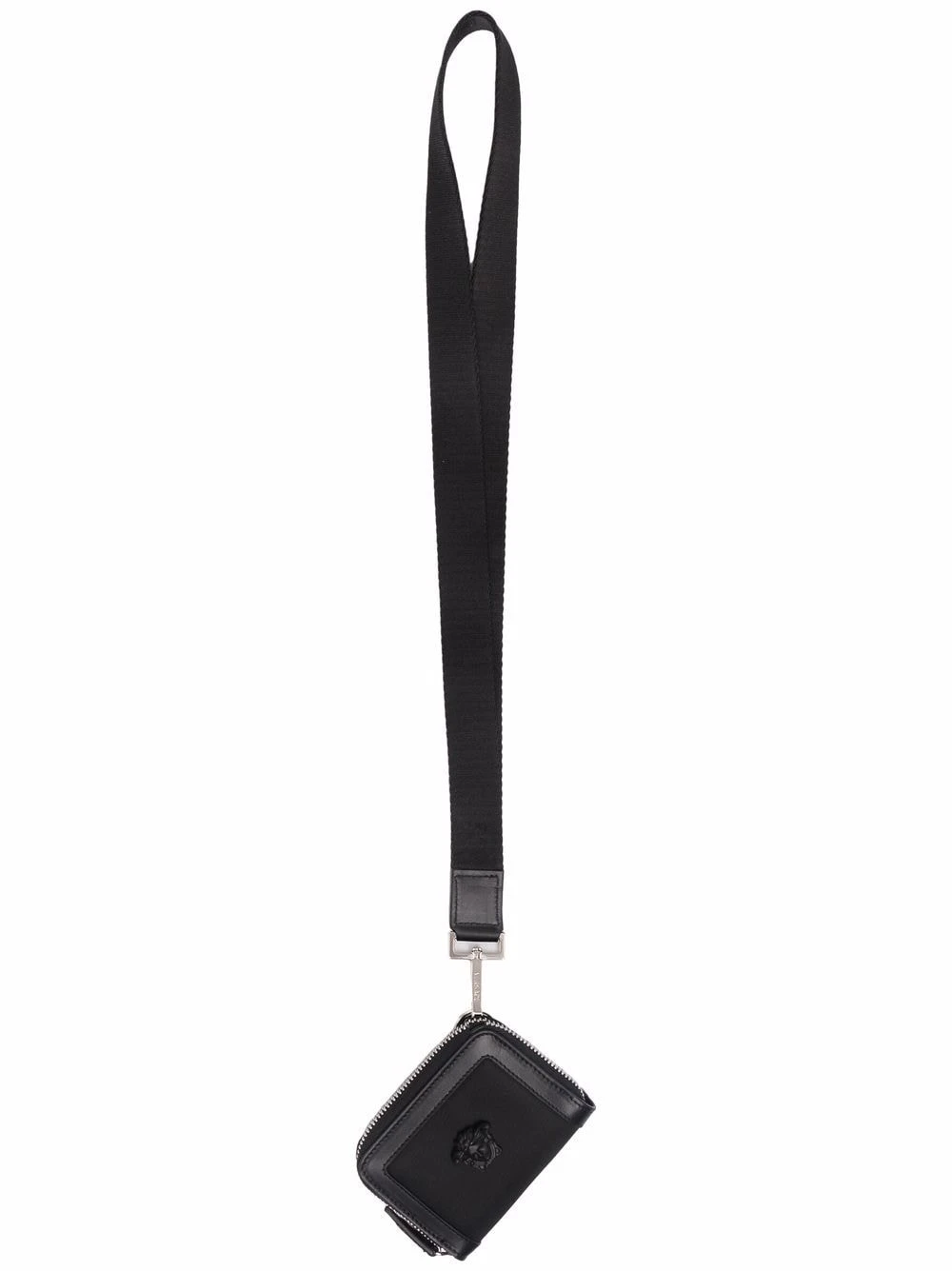 Noir, cuir, détail Medusa, bride porté autour du cou détachable, ornements argentés, fermeture zippée tout autour, coutures ton sur ton.