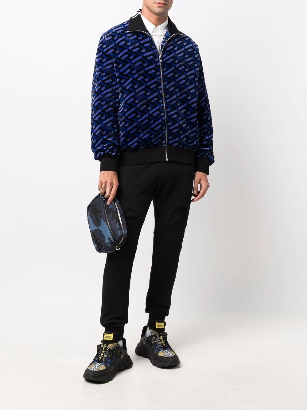Imprimé graphique intégral, imprimé monogrammé, fini texturé, col cheminée, effet d’épaules descendues, manches longues, fermeture zippée devant. Matière : coton.