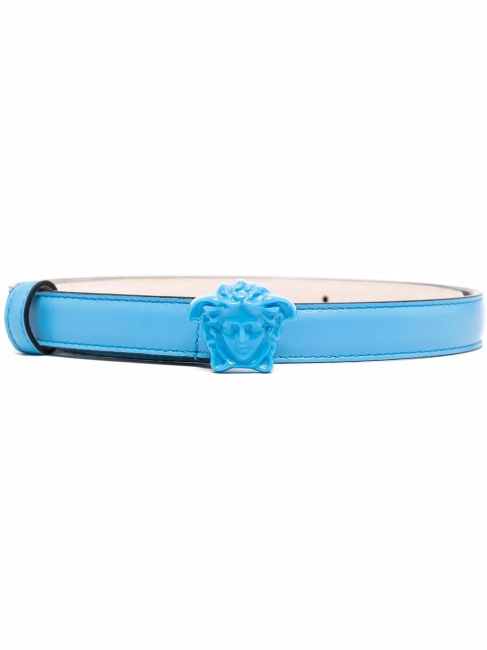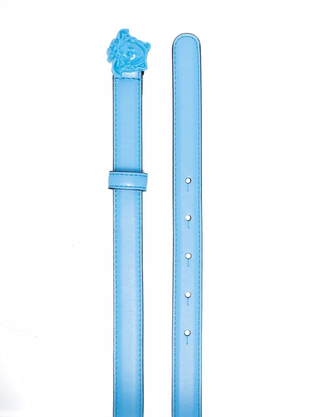 Détail Medusa, taille ajustable, passants de ceinture. Couleur : bleu. Matière : cuir.
