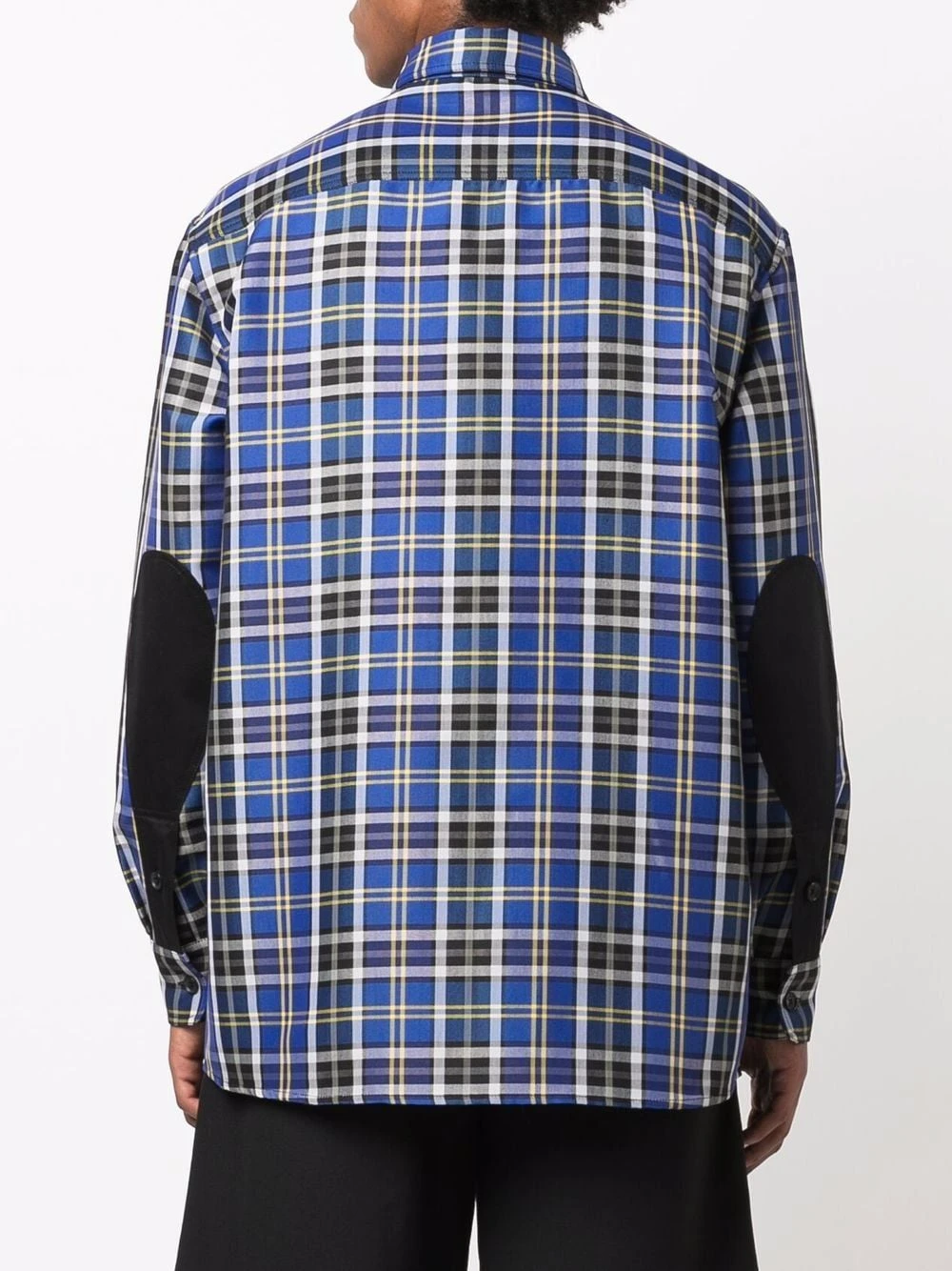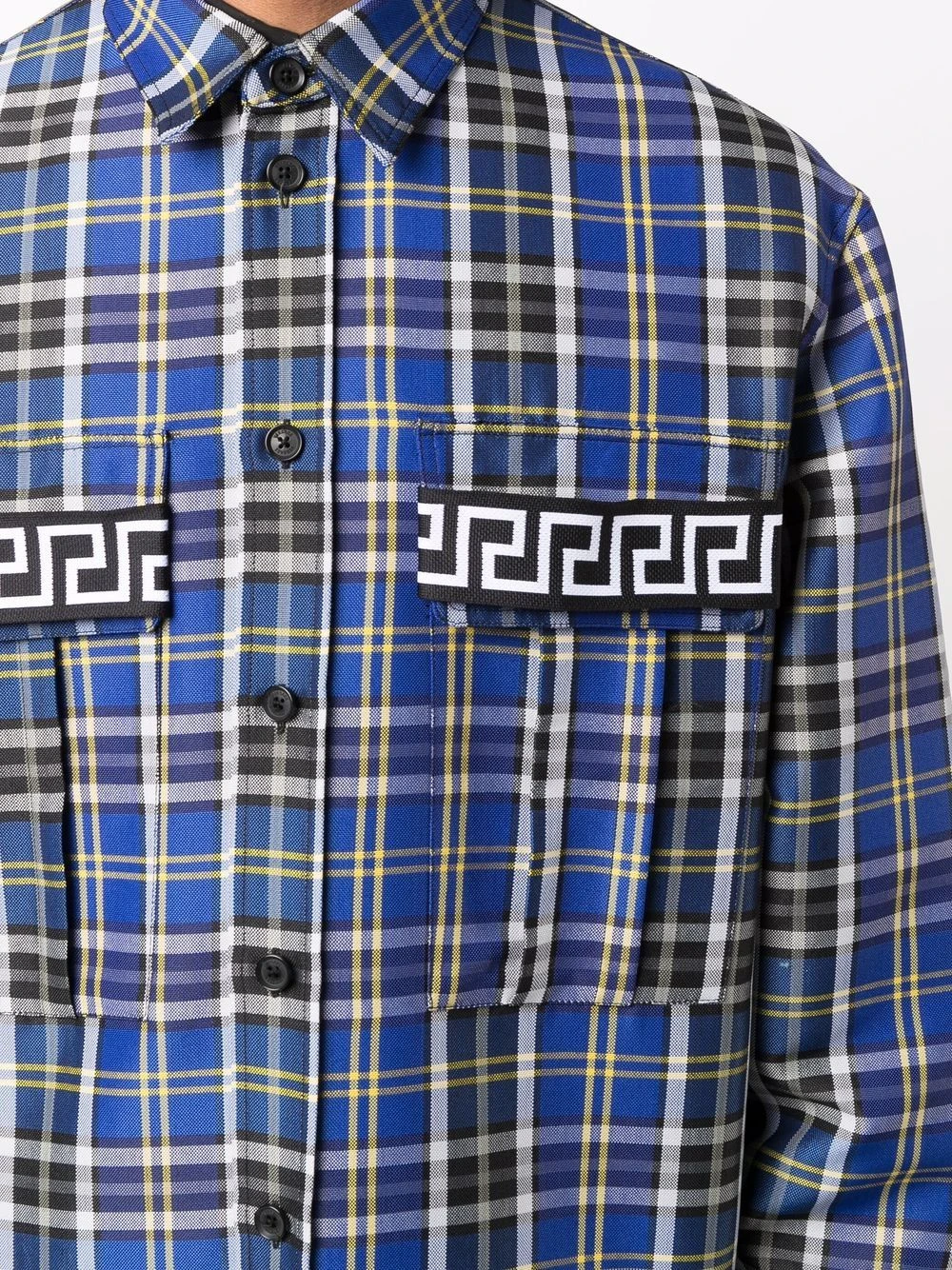 Carreaux Plaid, détail Greca signature, col classique, boutonnière sur le devant, poches poitrine à rabat, poignets boutonnés.