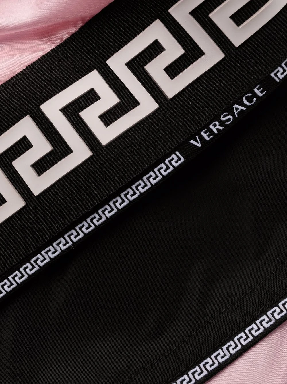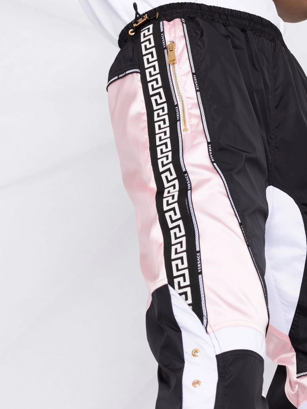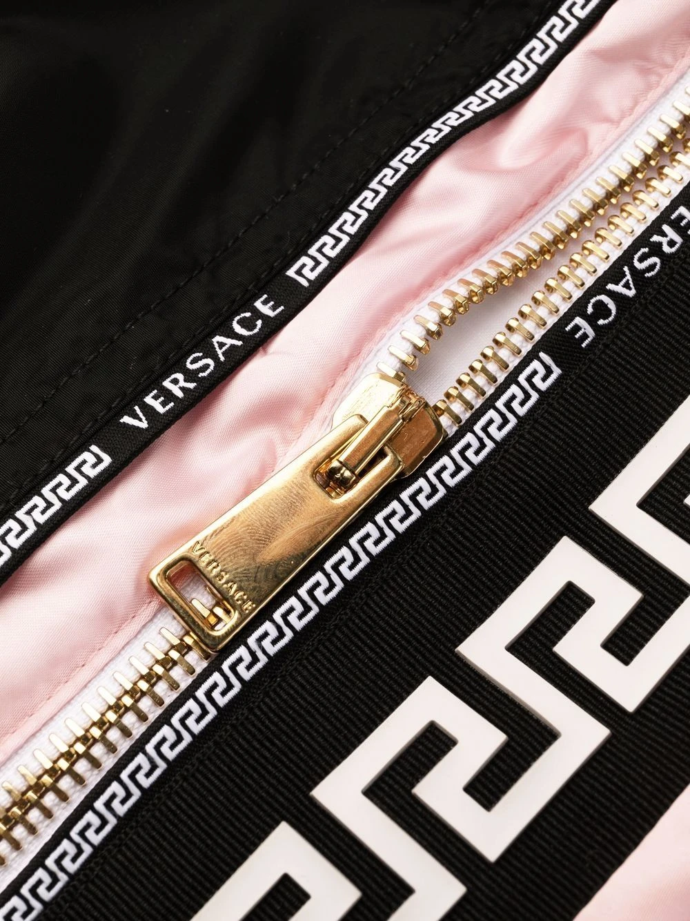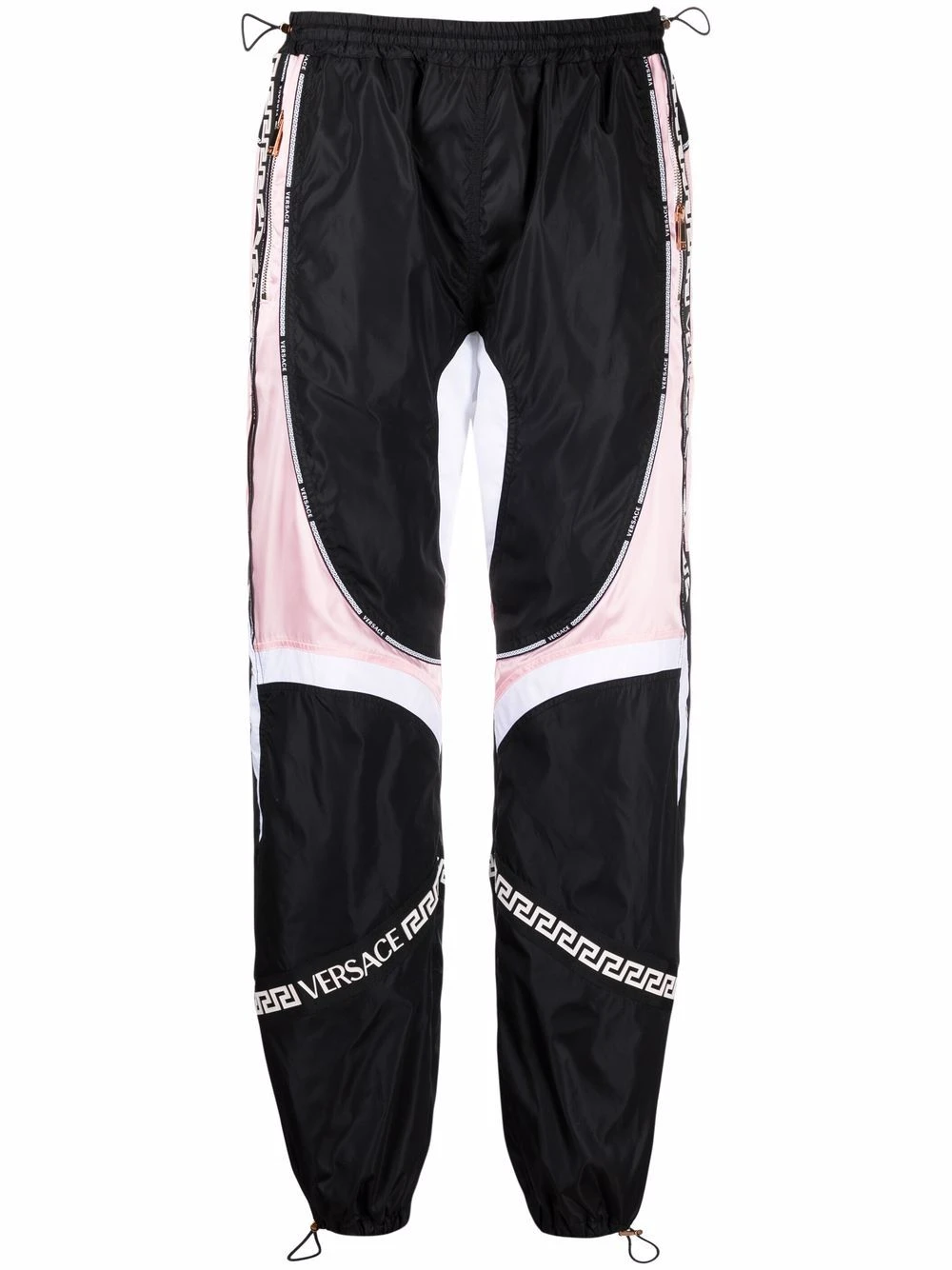 Design à empiècements, détail Greca signature, finition à bande logo, poignets élastiqués, taille élastique à lien de resserrage, deux poches latérales zippées.