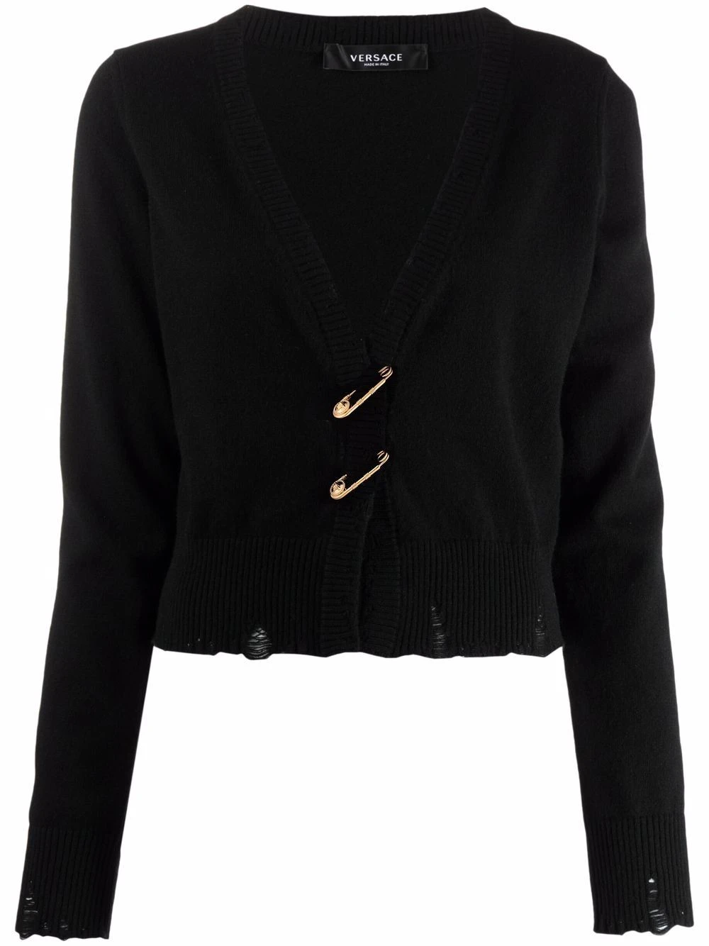 Détail d’épingle Medusa signature, effet usé, col v profond, manches longues, ourlet nervuré. Couleur : noir.