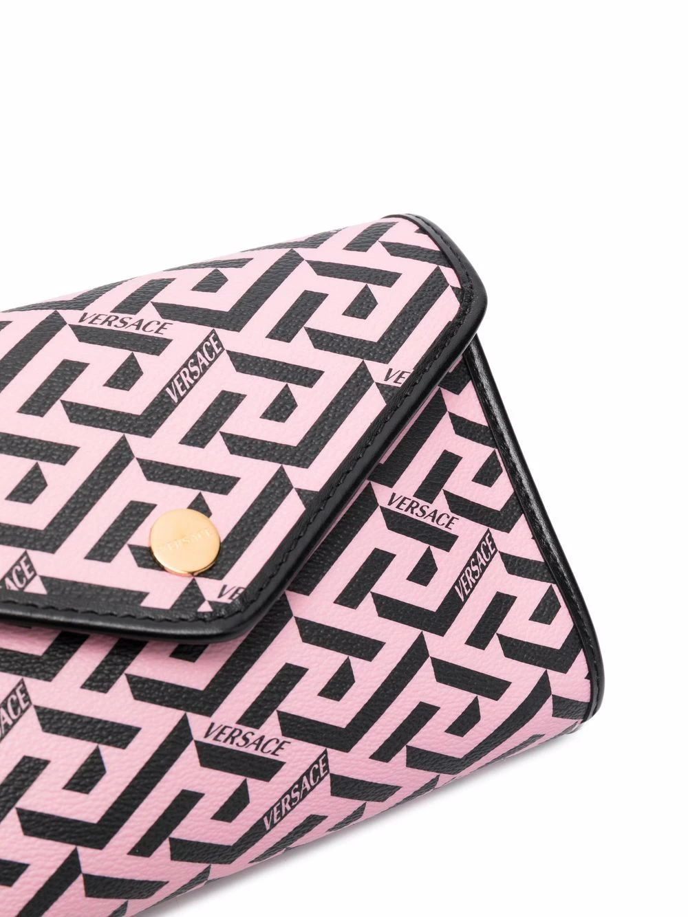 Motif Greca signature imprimé, finitions en métal doré, bordure contrastante, rabat sur le dessus à fermeture magnétique, bride porté épaule en chaîne. Matière : cuir de veau.