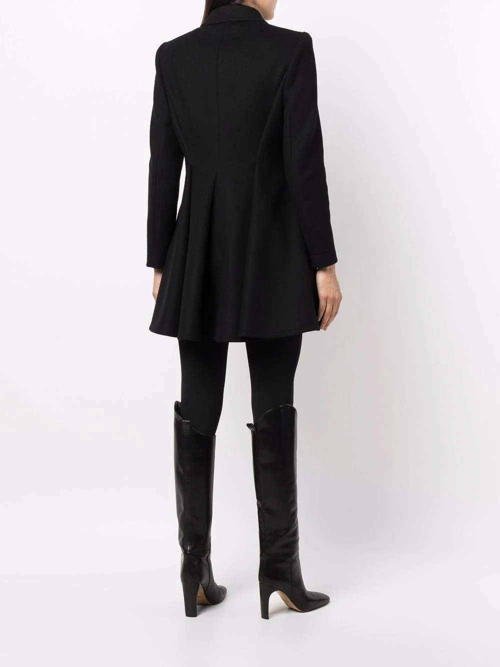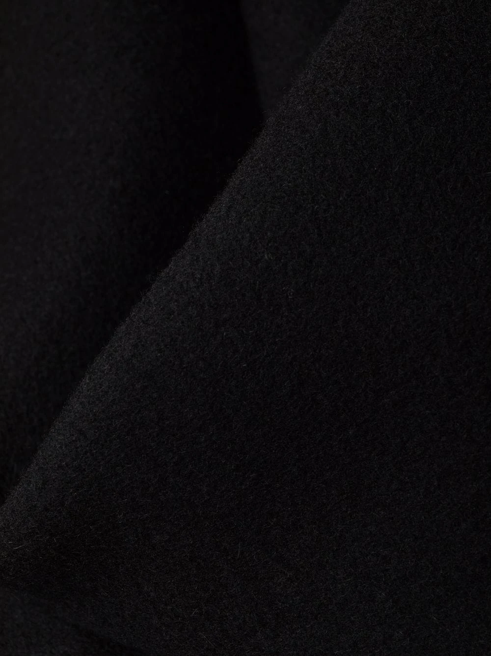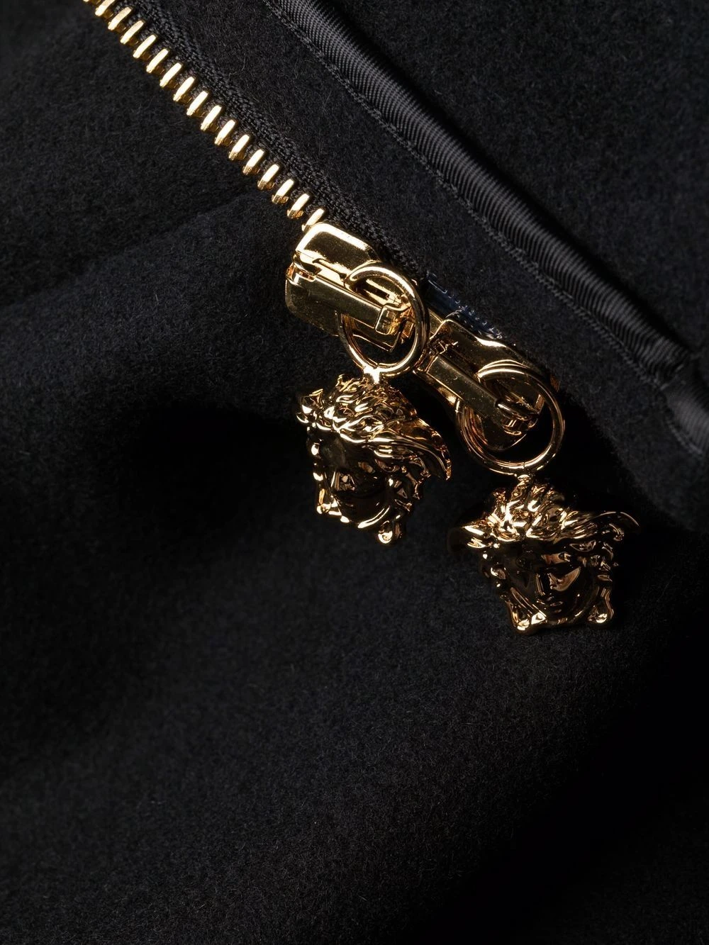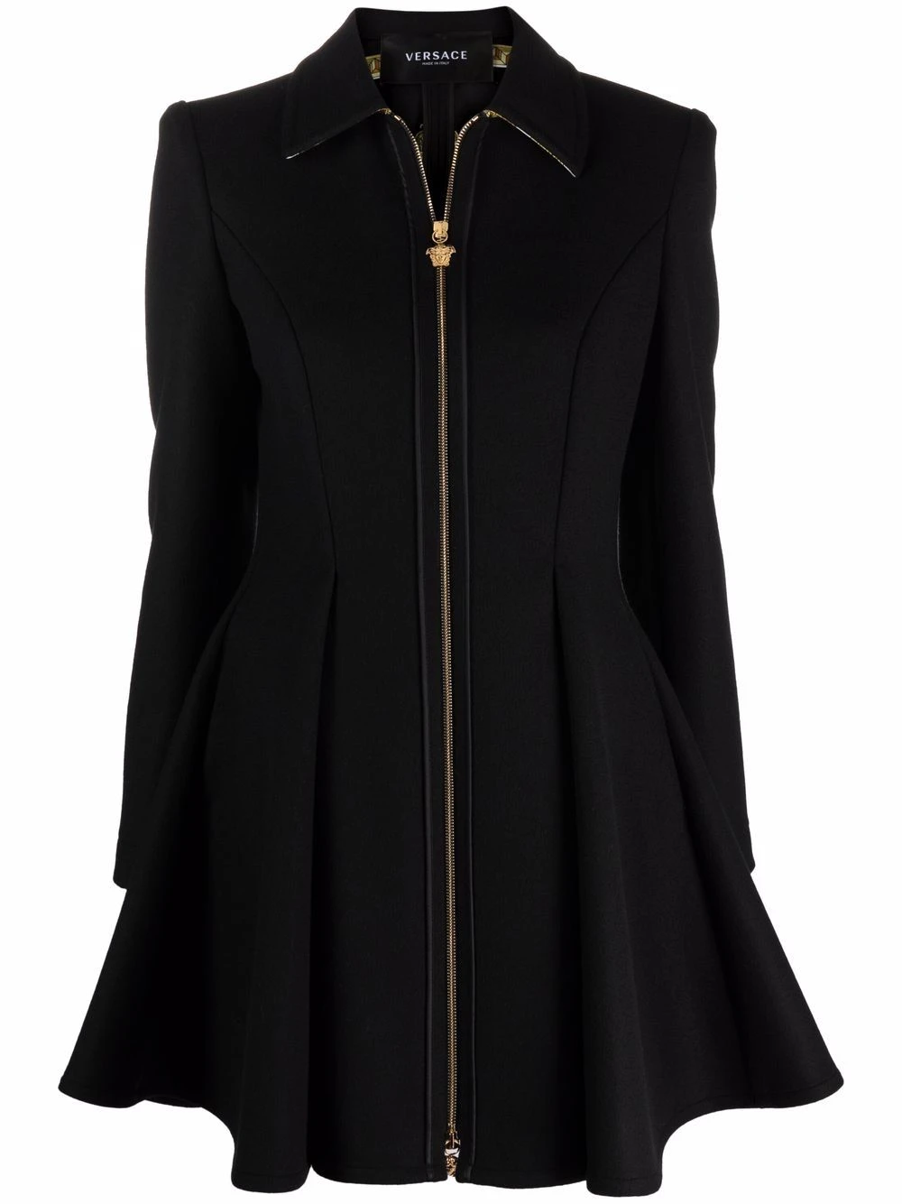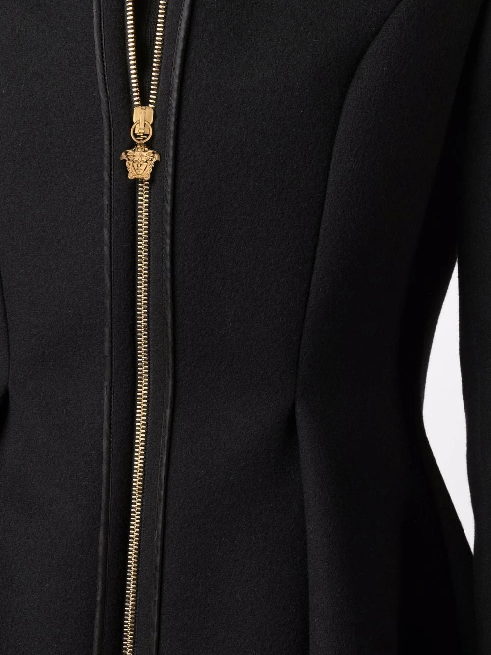 Col classique, fermeture zippée devant, détail Medusa, finitions en métal doré, manches longues, ourlet péplum. Couleur : noir. Matière : laine vierge.