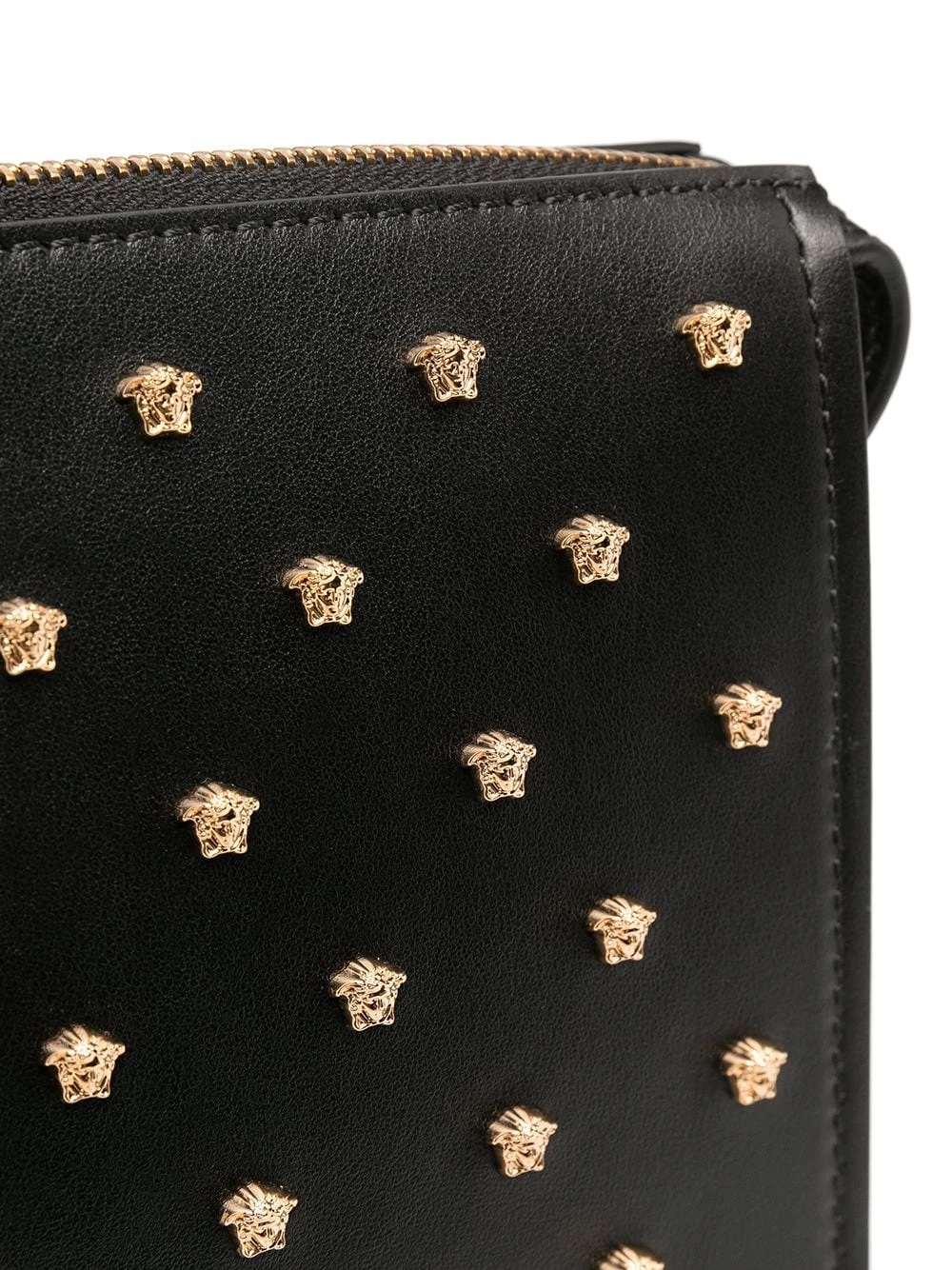 Détails de clous dorés, détail Medusa, fermeture zippée sur le dessus, logo doré, bride portée poignet, poche intérieure zippée. Couleur : noir. Matière : cuir.