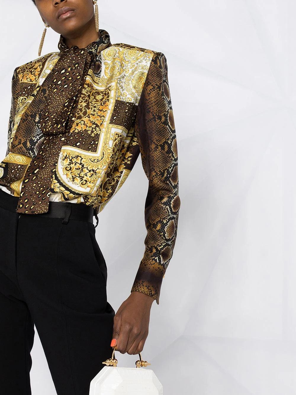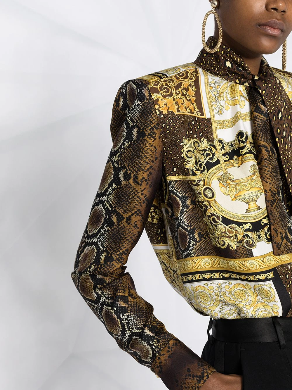 Imprimé signature, col lavallière à nouer, épaulettes, manches longues, manches à poignets boutonnés, boutonnière dissimulée sur le devant. Matière : soie.