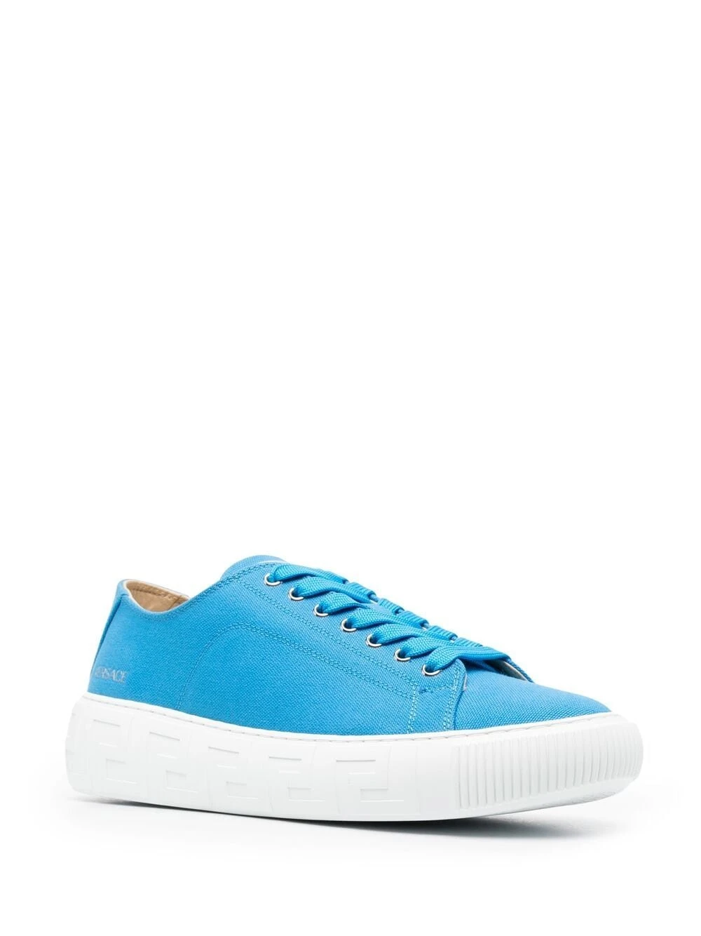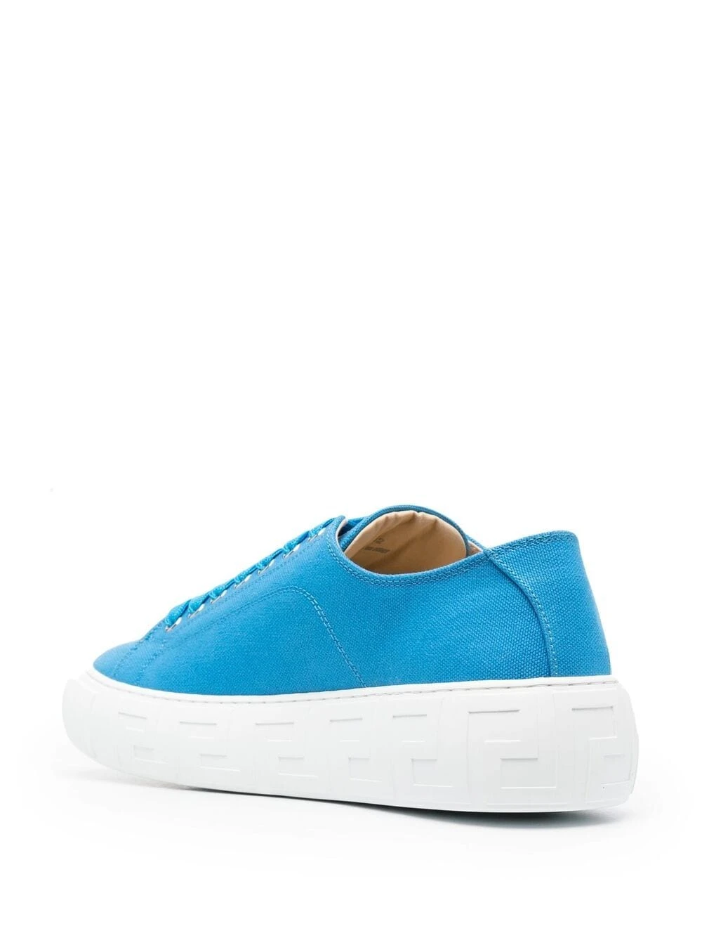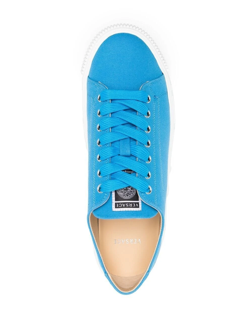 Détail Greca signature, logo imprimé sur le côté, bout rond, fermeture à lacer sur le devant, languette à patch logo, semelle intérieure à logo, semelle plate en caoutchouc. Couleur : bleu. Matière : coton.