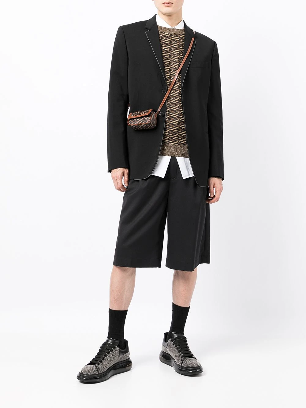 Imprimé La Greca signature, bretelles croisées, finitions en métal doré, logo gravé, rabat sur le devant, compartiment principal, patch logo intérieur. Couleur : marron. Matière : cuir.