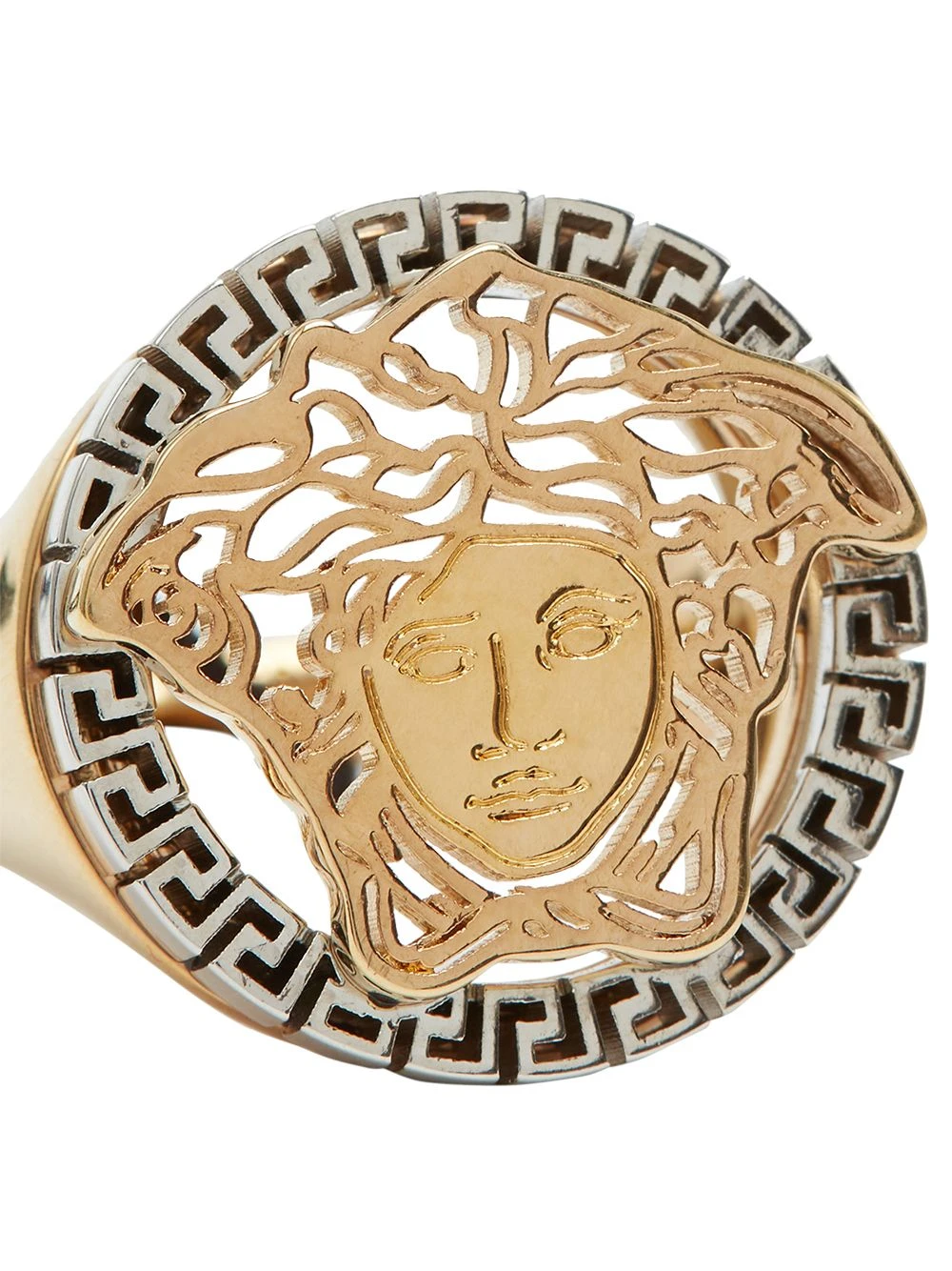 Détail Greca signature, motif Medusa, chevalière. Matière : laiton plaqué or.