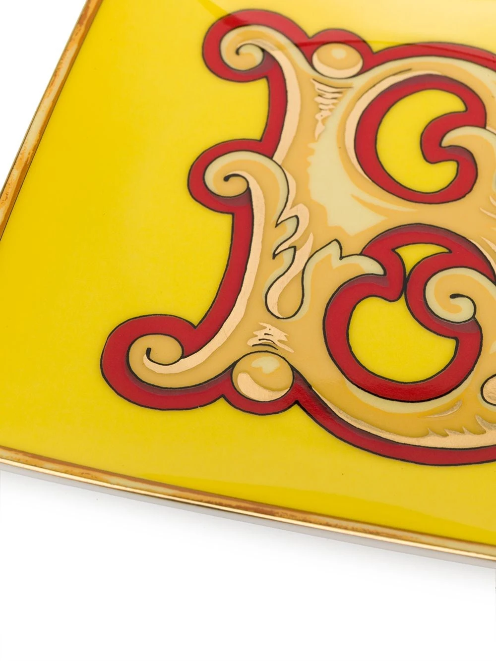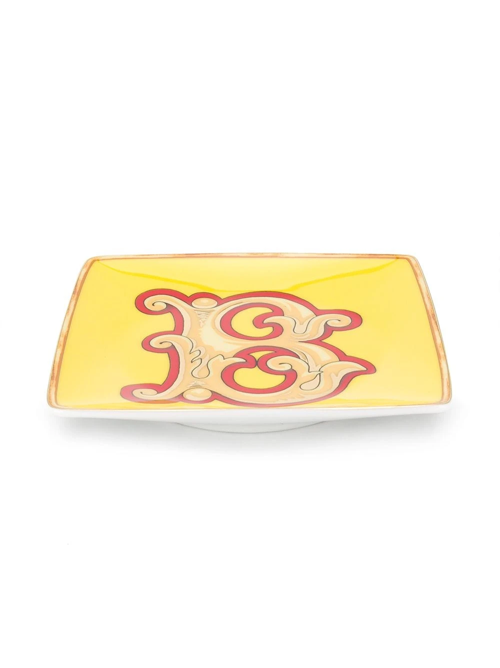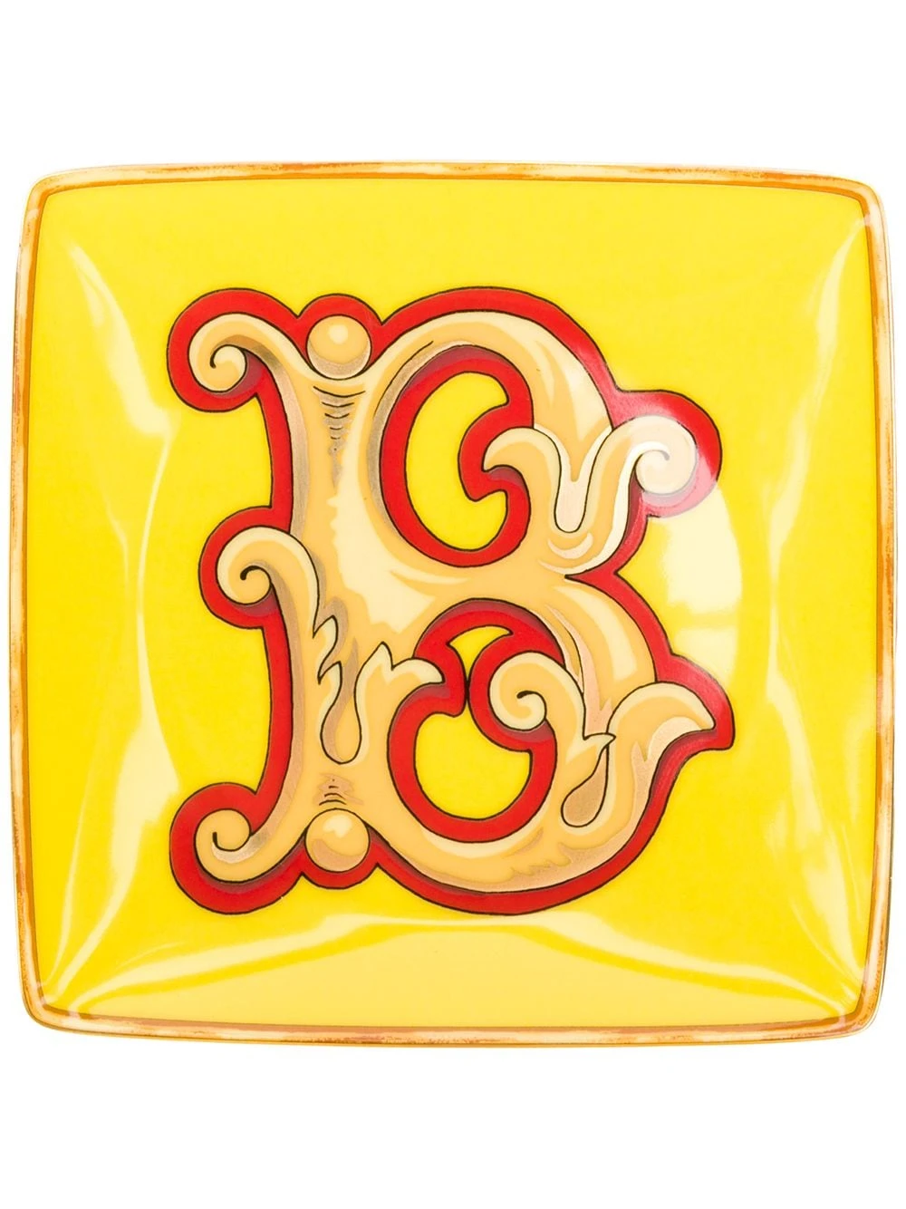 Assiestte Holiday Alphabet ‘B’ Versace Home avec forme carrée, dessus concave et imprimé baroque. Couleur : jaune.