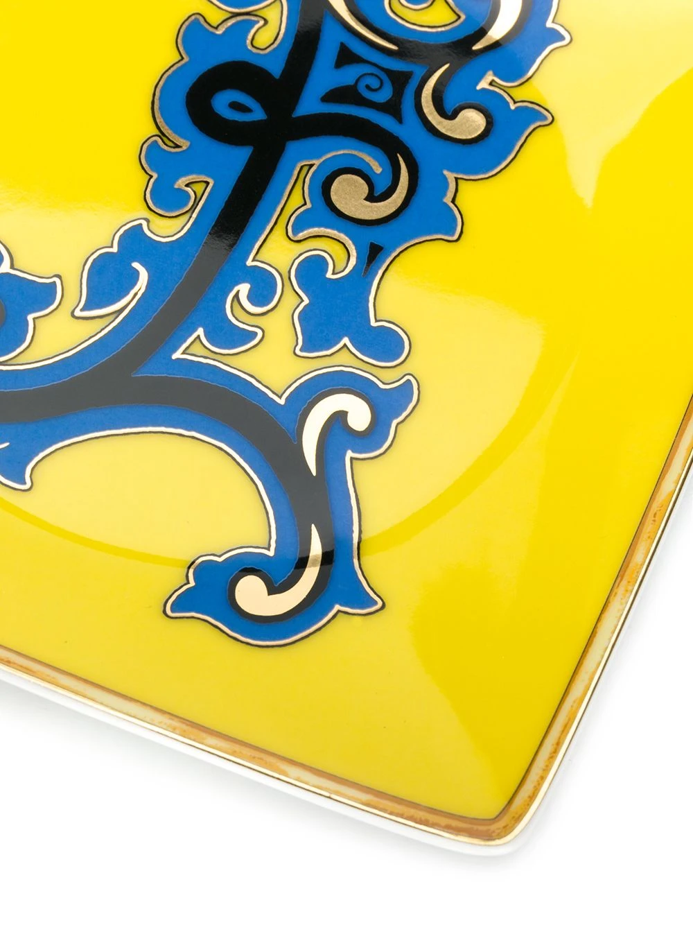 Assiestte Holiday Alphabet ‘E’ Versace Home avec forme carrée, dessus concave et imprimé baroque. Couleur : jaune.