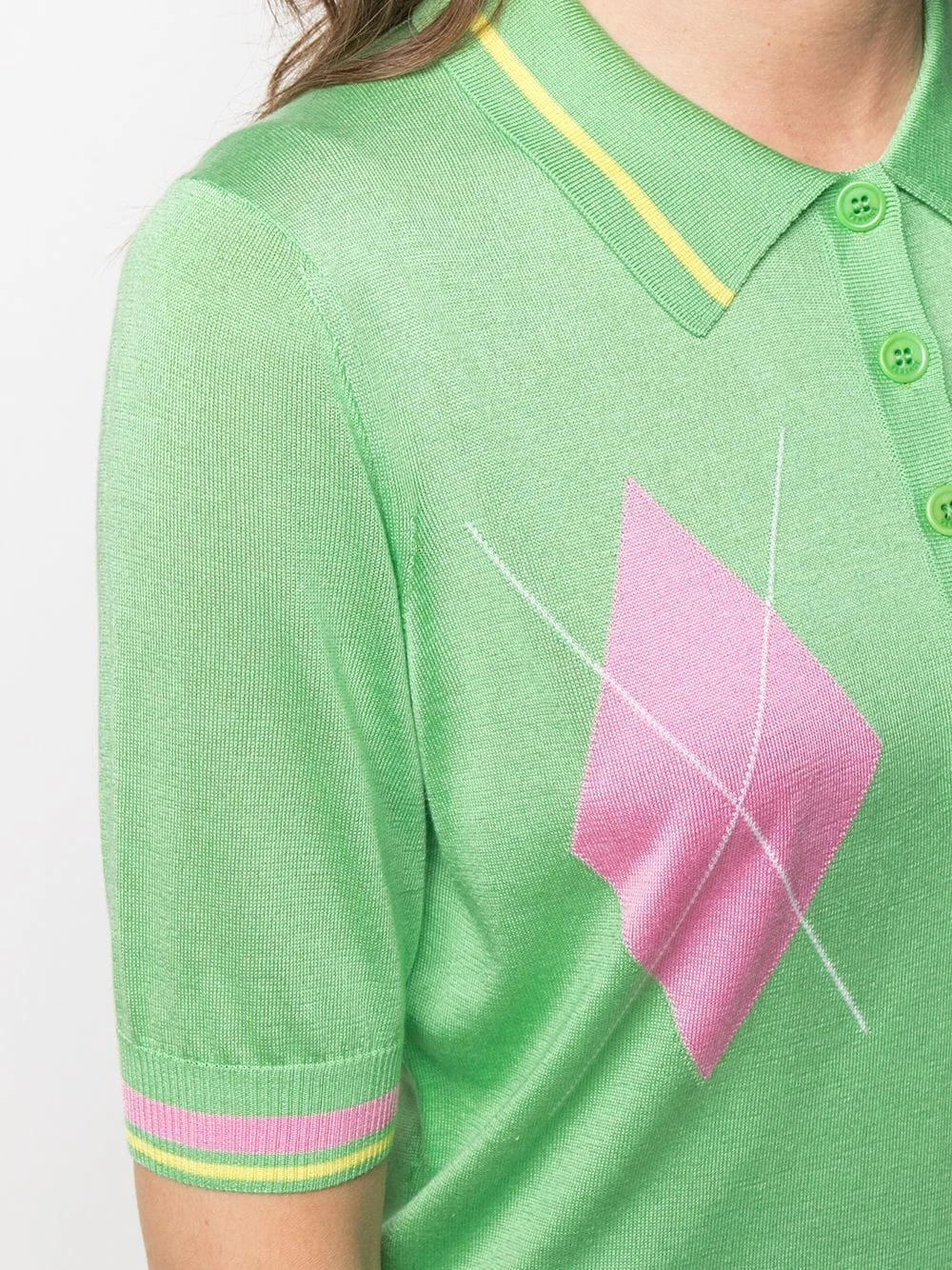 Motif losange, maille fine, col polo, manches courtes. Matière : soie.