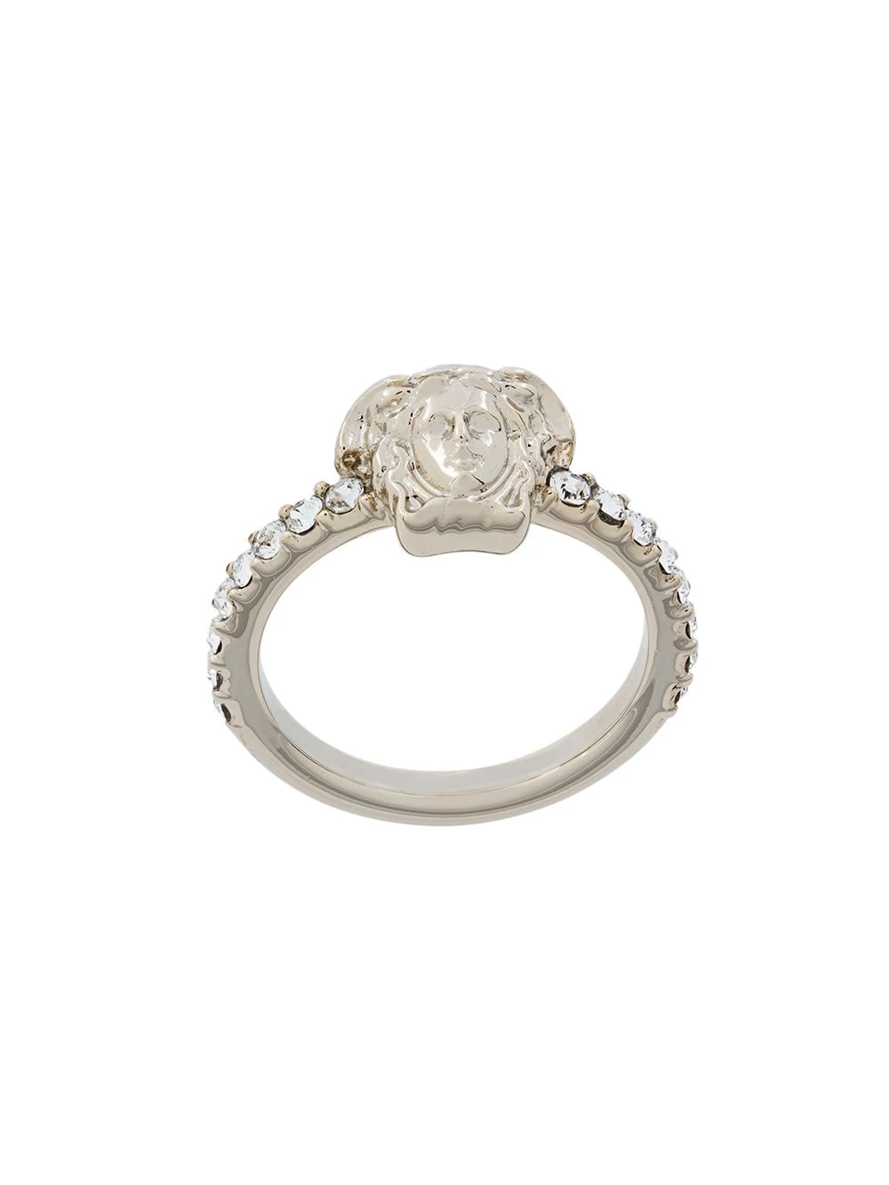 Bague Medusa en métal Versace avec un ornement à logo Medusa et ornements en cristal. Couleur: doré.