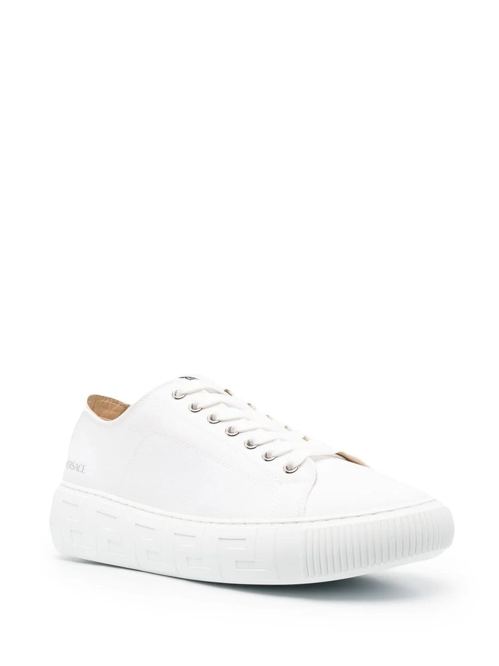 Détail Greca signature, logo imprimé sur le côté, bout rond, fermeture à lacer sur le devant, semelle intérieure à logo, semelle plate en caoutchouc. Couleur : blanc. Matière : coton.