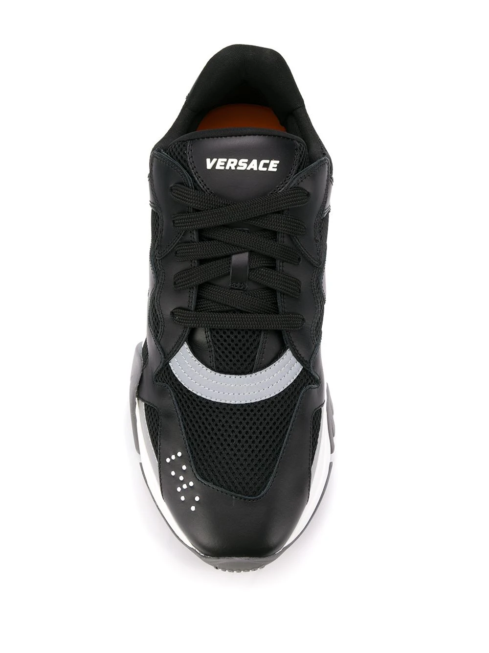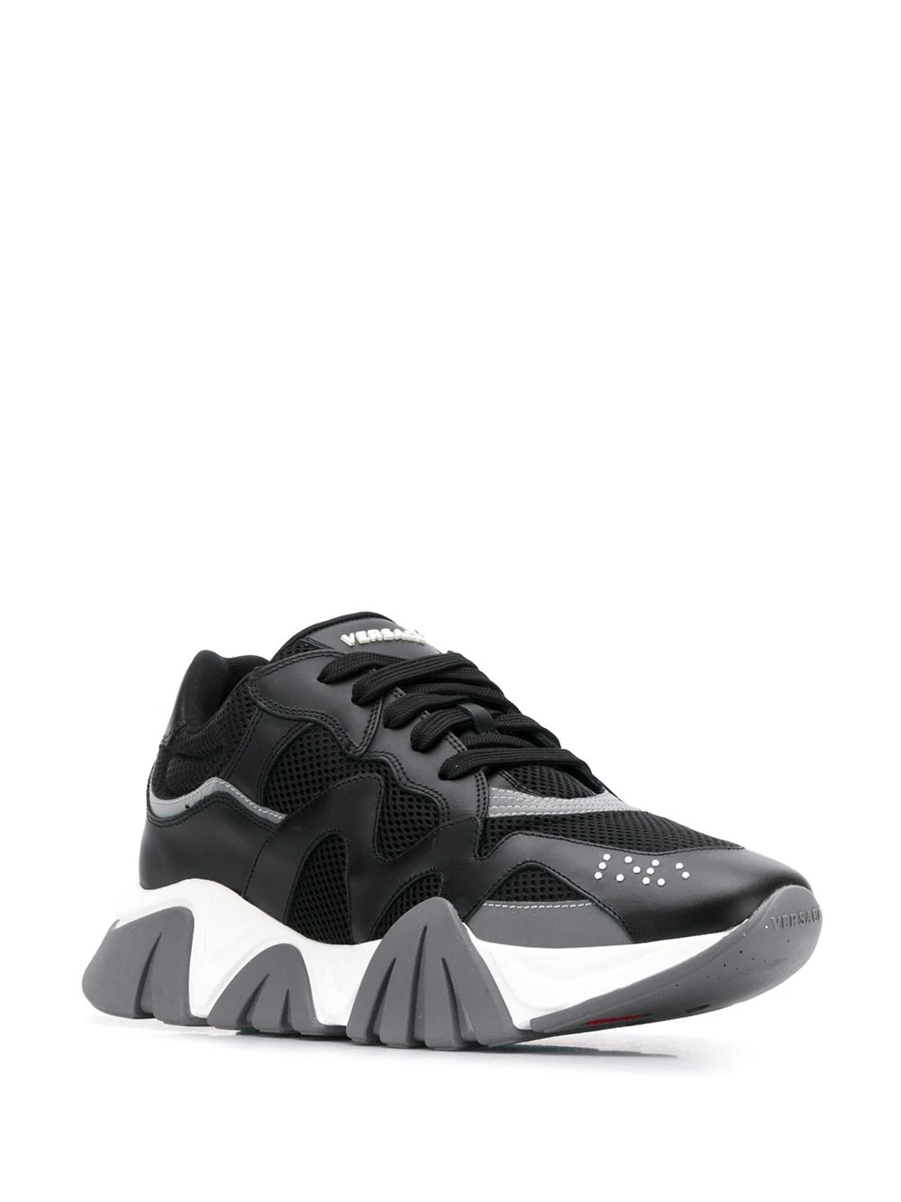 Baskets Squalo en cuirs Versace avec bout rond, fermeture à lacer sur le devant, patch logo sur la languette, empiècements en résille et monogramme sur le talon.