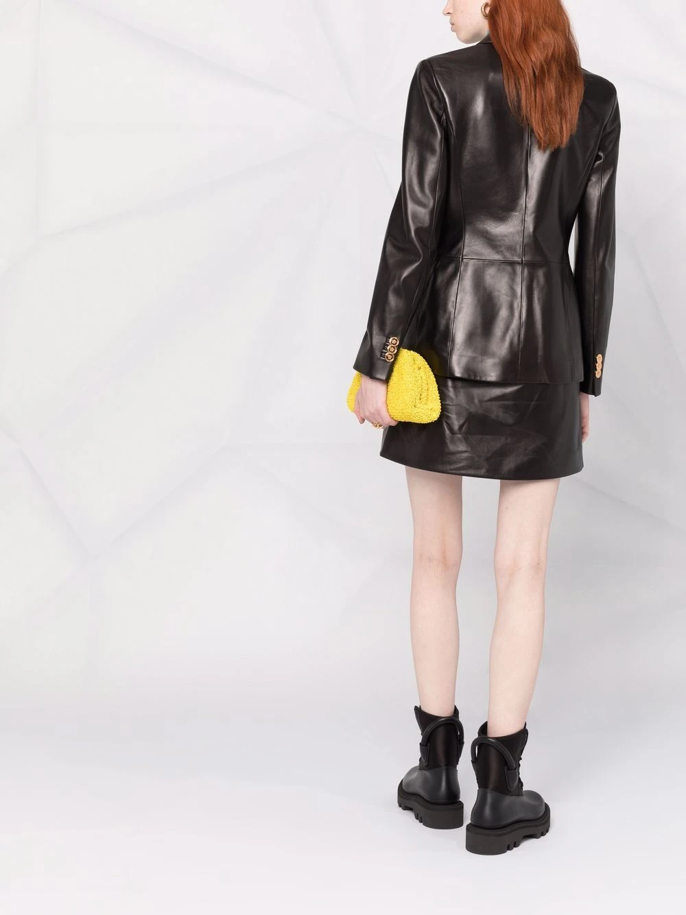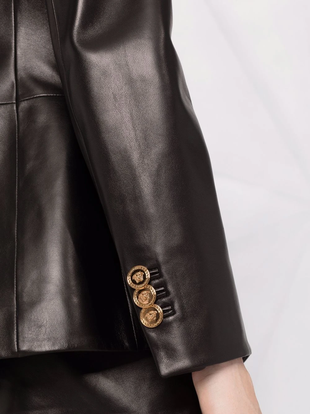 Revers pointus, boutonnière sur le devant, boutons dorés à détails embossés, manches longues, poignets boutonnés, poches devant à rabat, doublure intégrale. Couleur : noir.