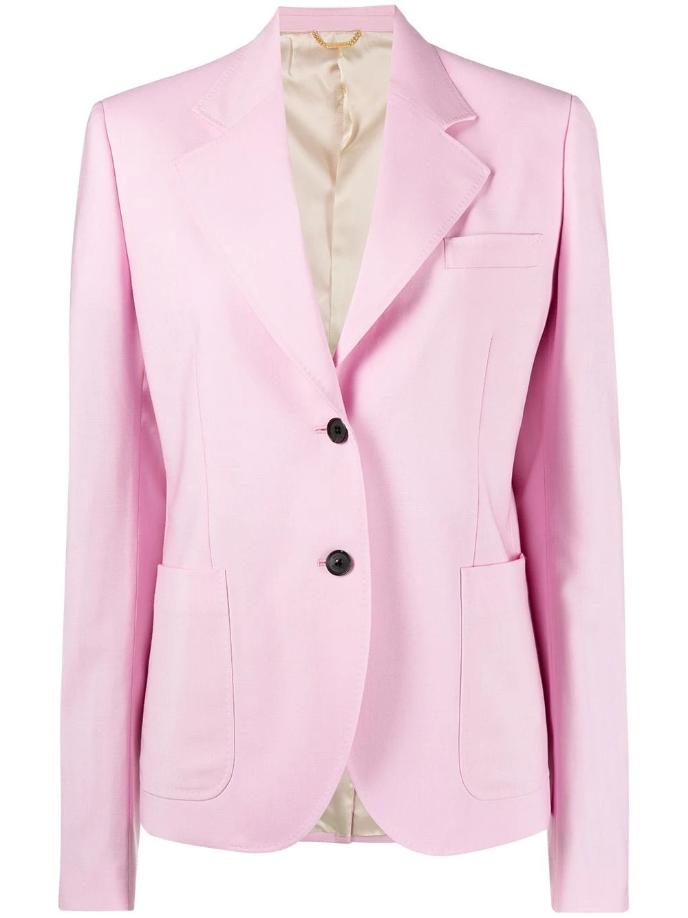 Revers crantés, manches longues, poignets boutonnés, boutonnière sur le devant, poche passepoilée sur la poitrine, deux poches plaquées avant, ourlet droit. Couleur : Rose.