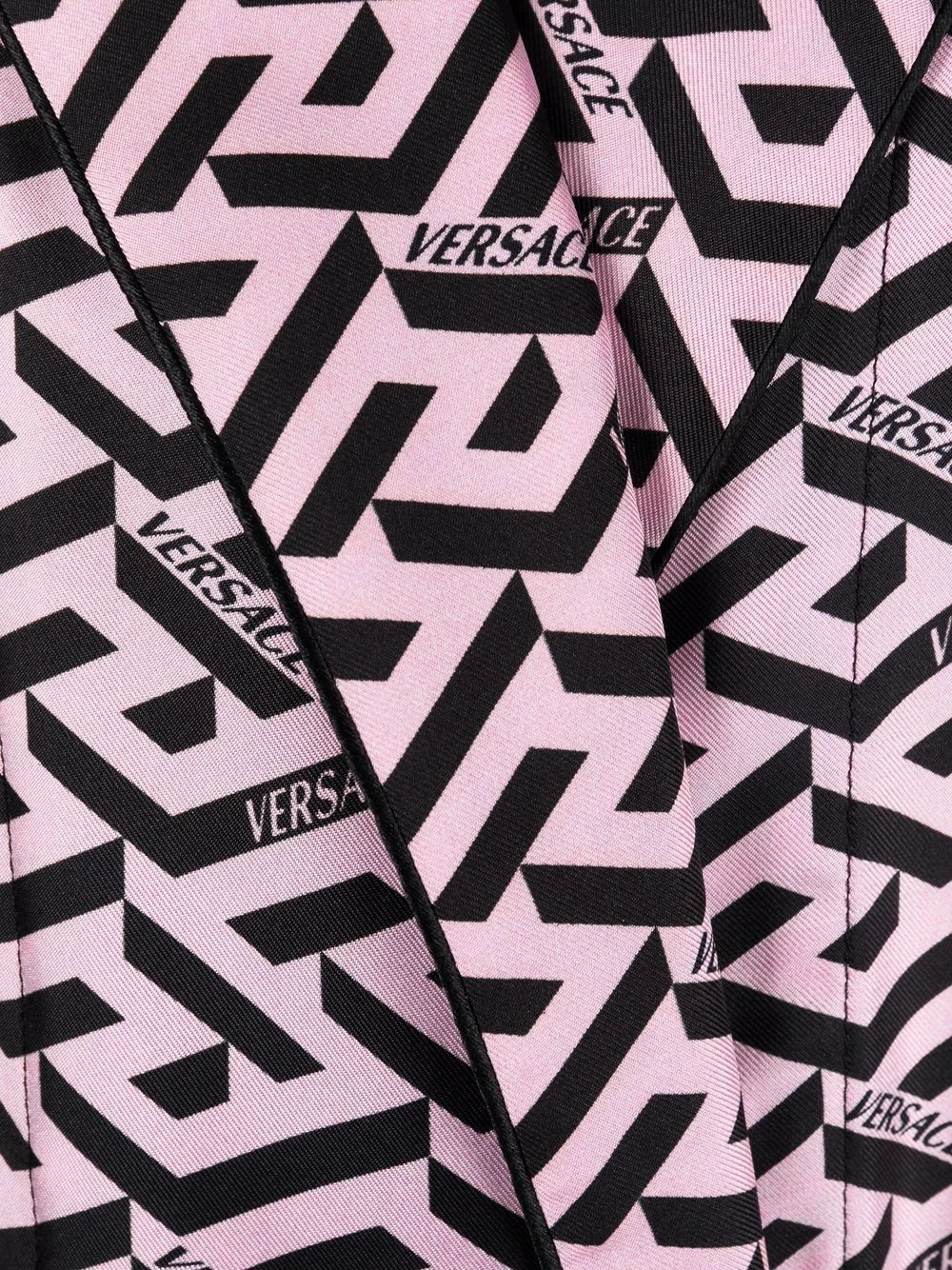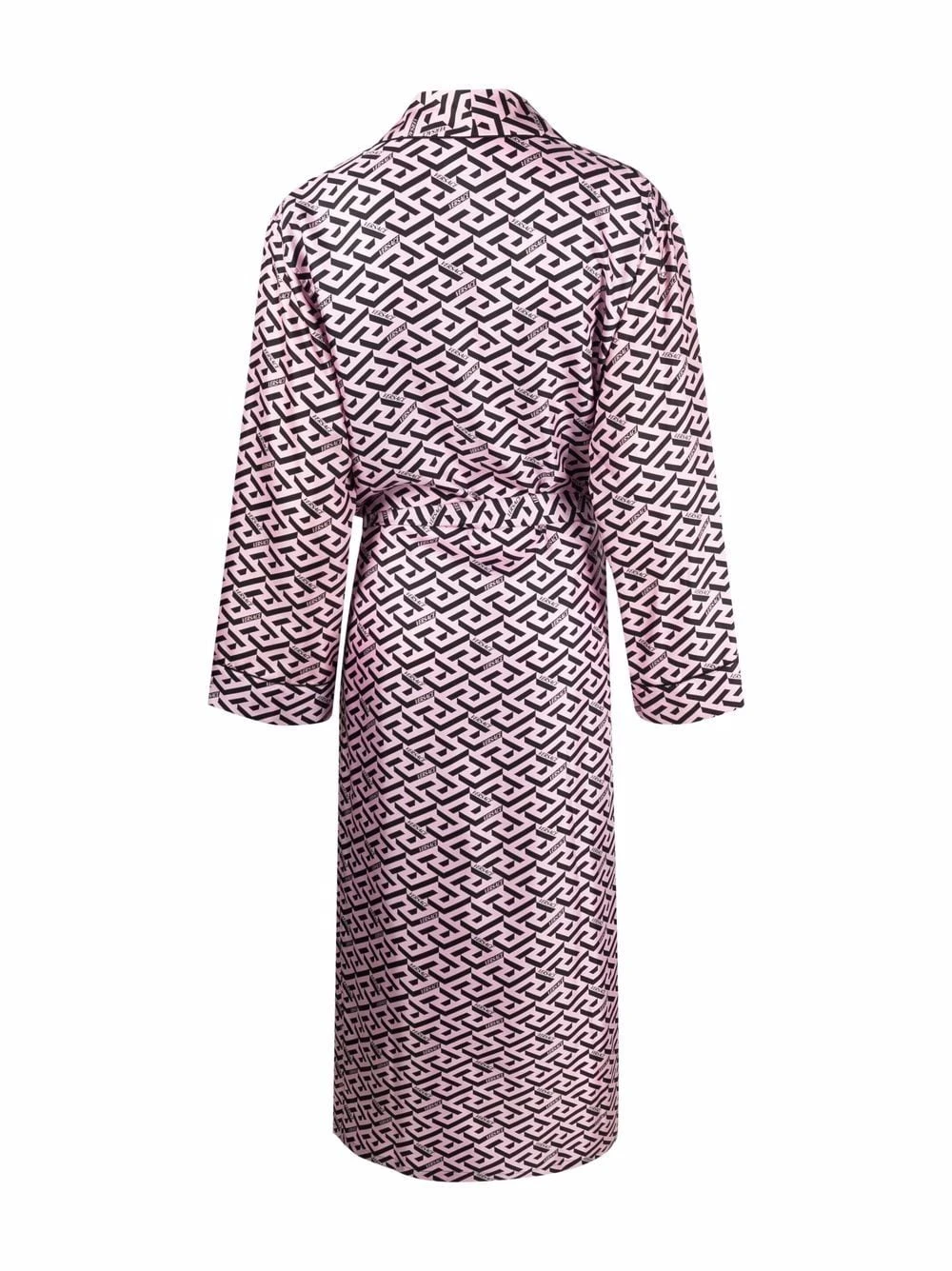 Imprimé La Greca signature, col châle, manches longues, coupe longue, taille nouée. Matière : soie.