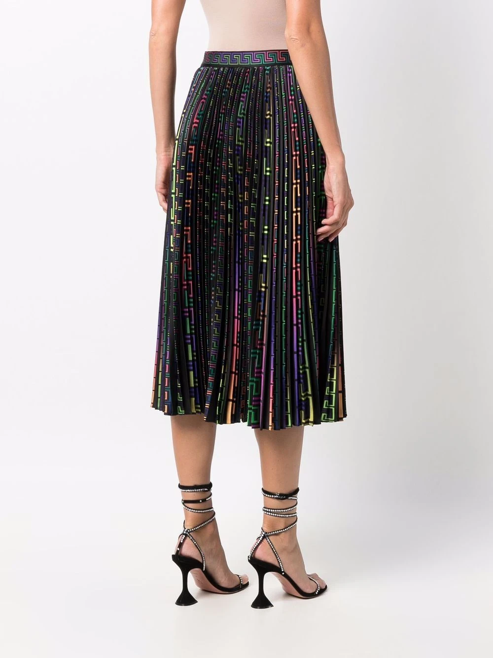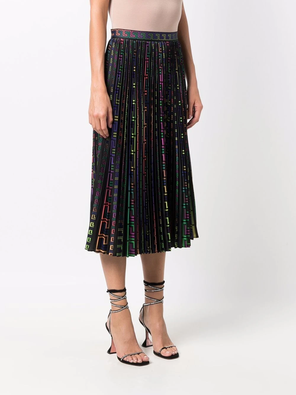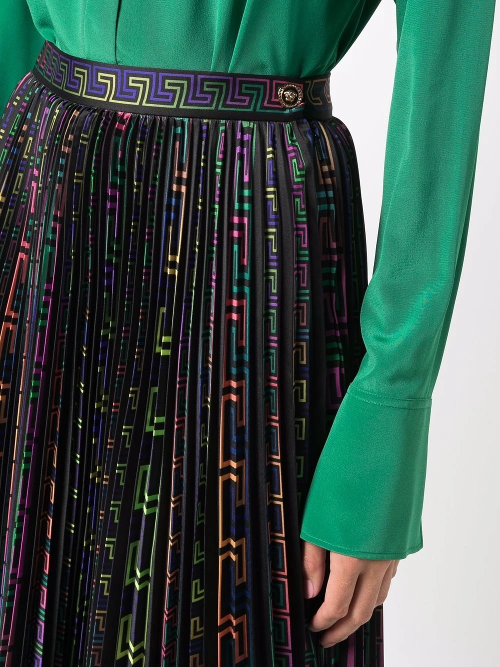 Détail Greca signature, design plissé, taille haute, coupe mi-longue.