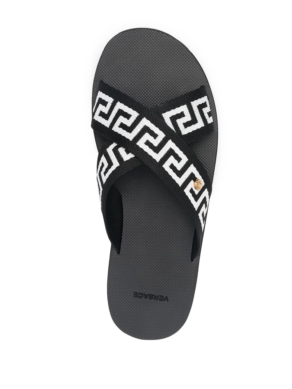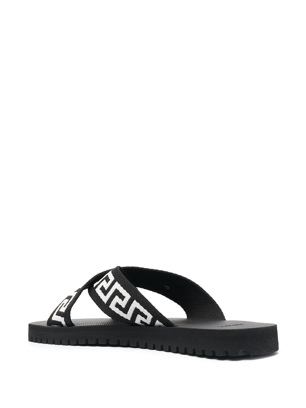 Détail Greca signature, bout ouvert, détail de brides croisées, design à enfiler, semelle plate en caoutchouc. Couleur : Noir. Matière : caoutchouc.