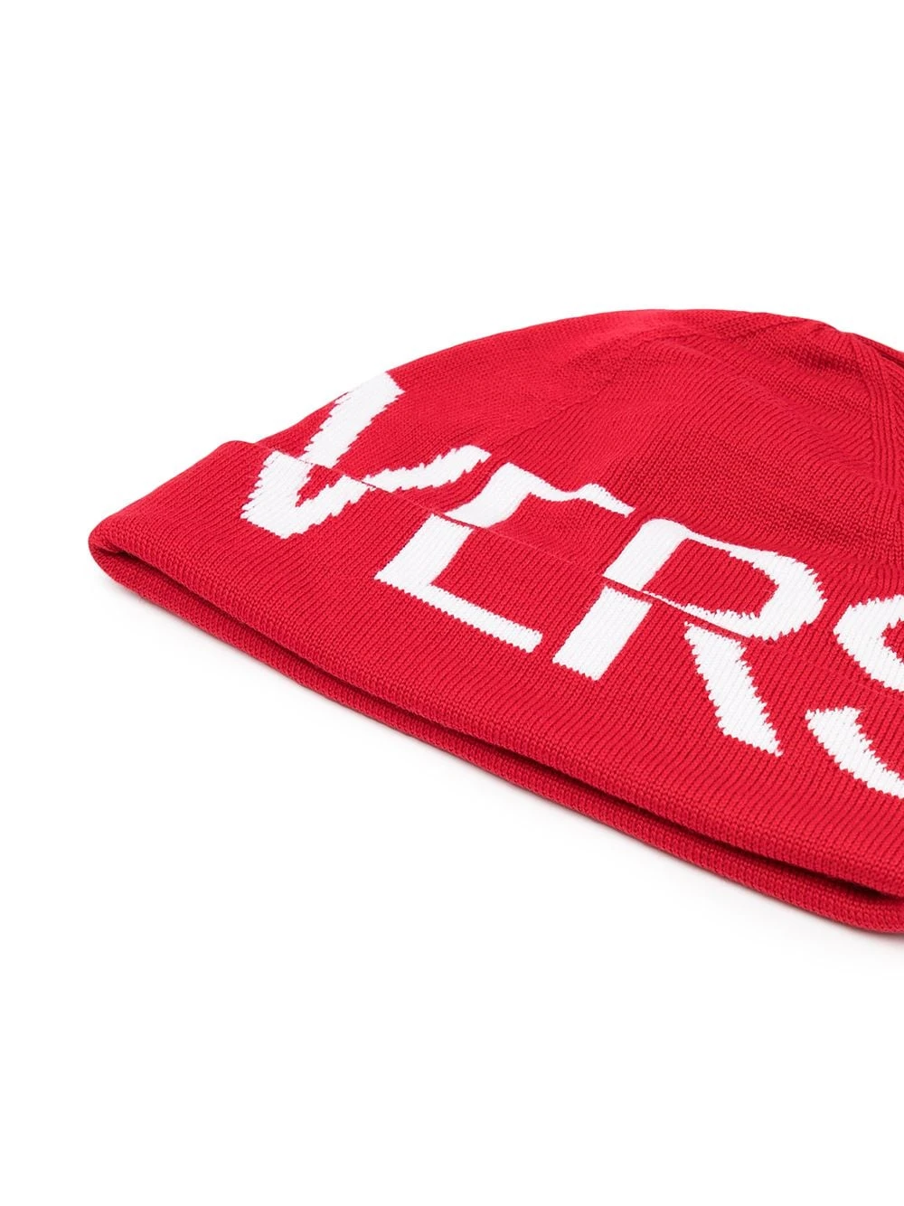 Logo intarsia, design tricoté, bord retroussé. Couleur : rouge. Matière : laine.