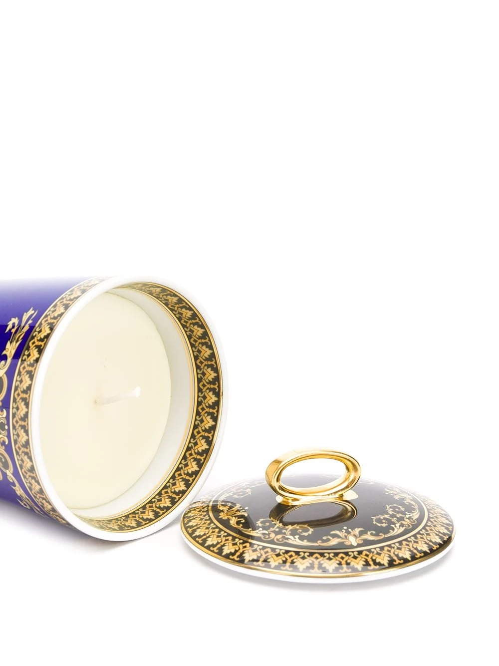 Bougie parfumée Medusa Versace Home avec imprimé baroque et anse sur le dessus.