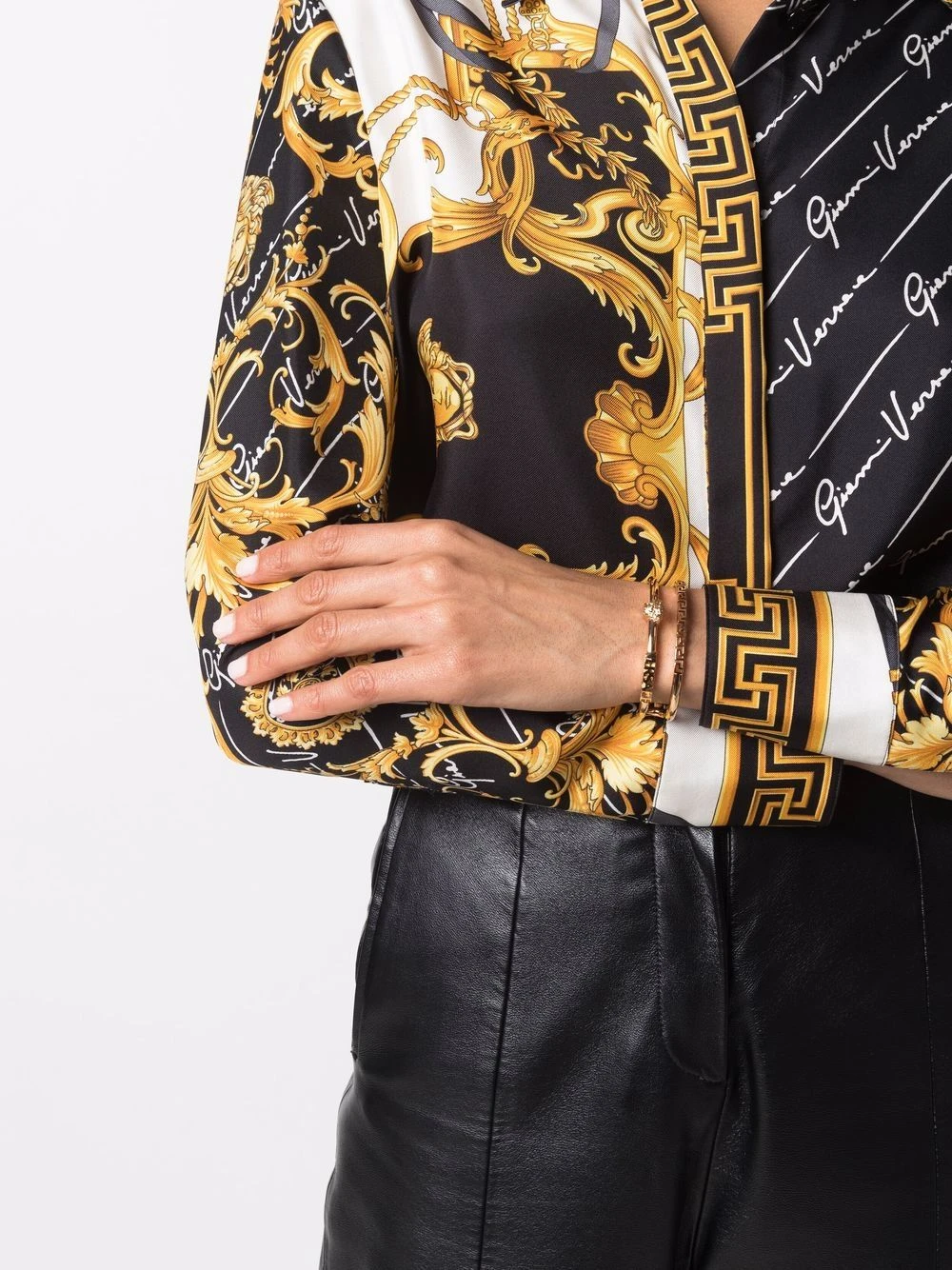 Détail Medusa, plaque logo, motif Greca signature imprimé, finitions en métal doré, design torque.