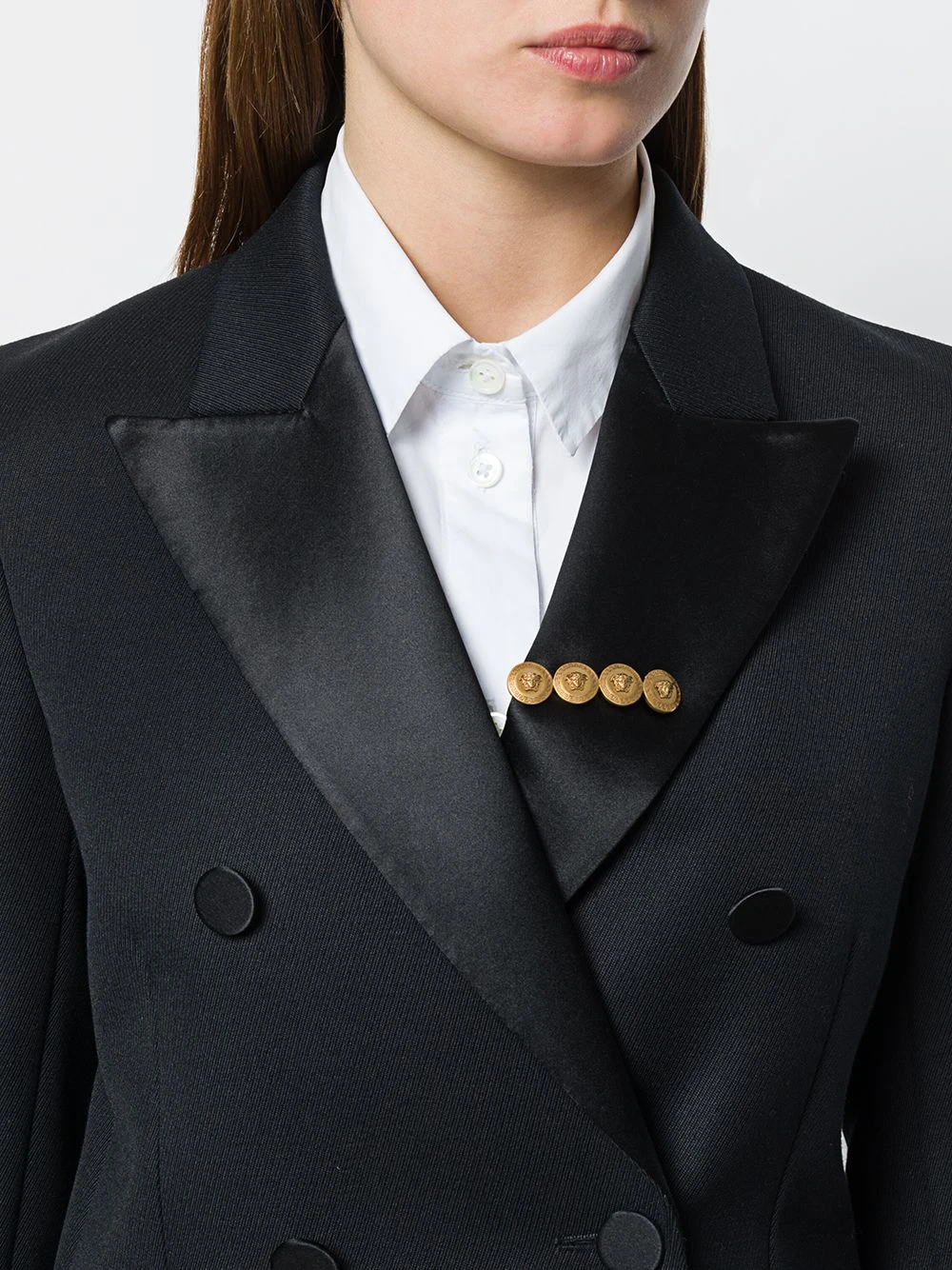 Broche en métal doré à plaque Medusa Versace avec détail de pièce, détail Medusa et fermeture clip.