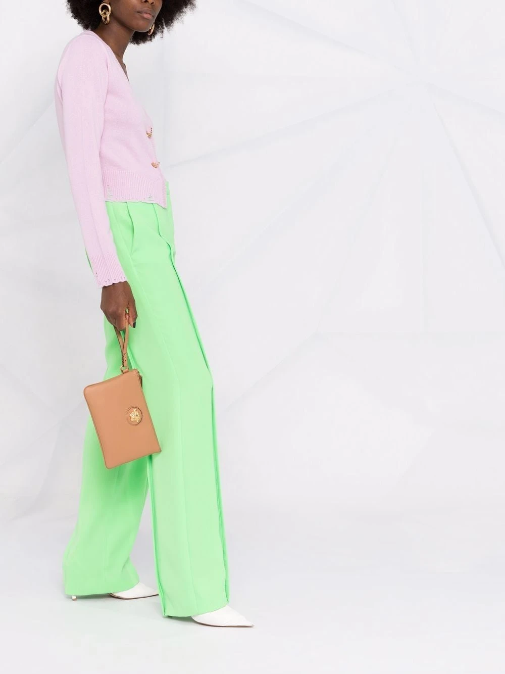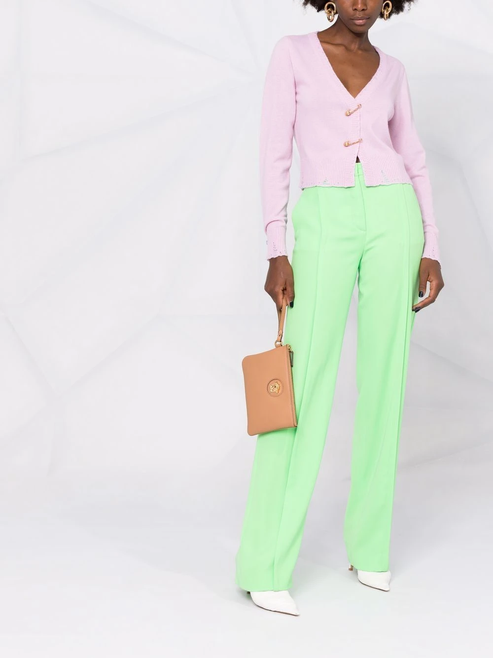Détail d’épingle à nourrice, effet usé, ourlet nervuré, col v profond, manches longues.