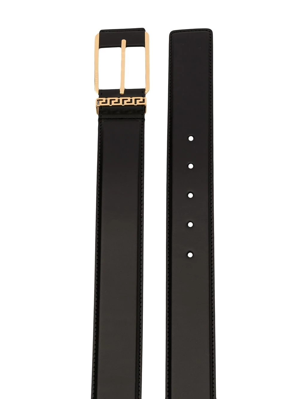 Détail Greca signature, fermeture à boucle dorée, trous pré-percés, taille ajustable. Couleur : noir. Matière : cuir de veau.