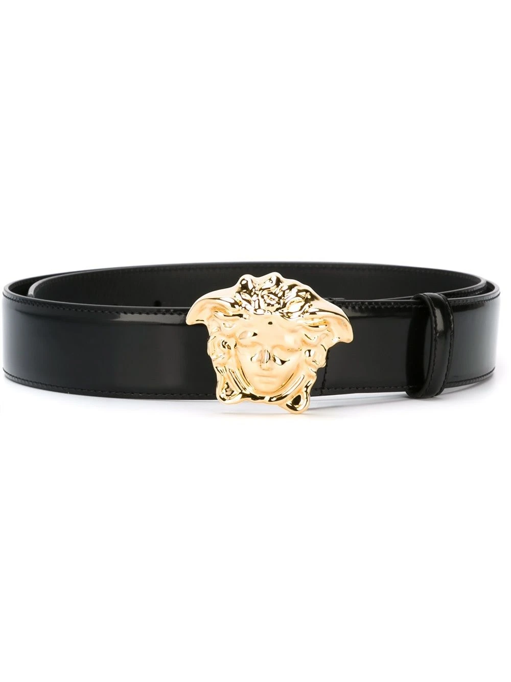 Ceinture à boucle Medusa en cuir de veau Versace avec finitions dorées et taille ajustable. Couleur : noir.