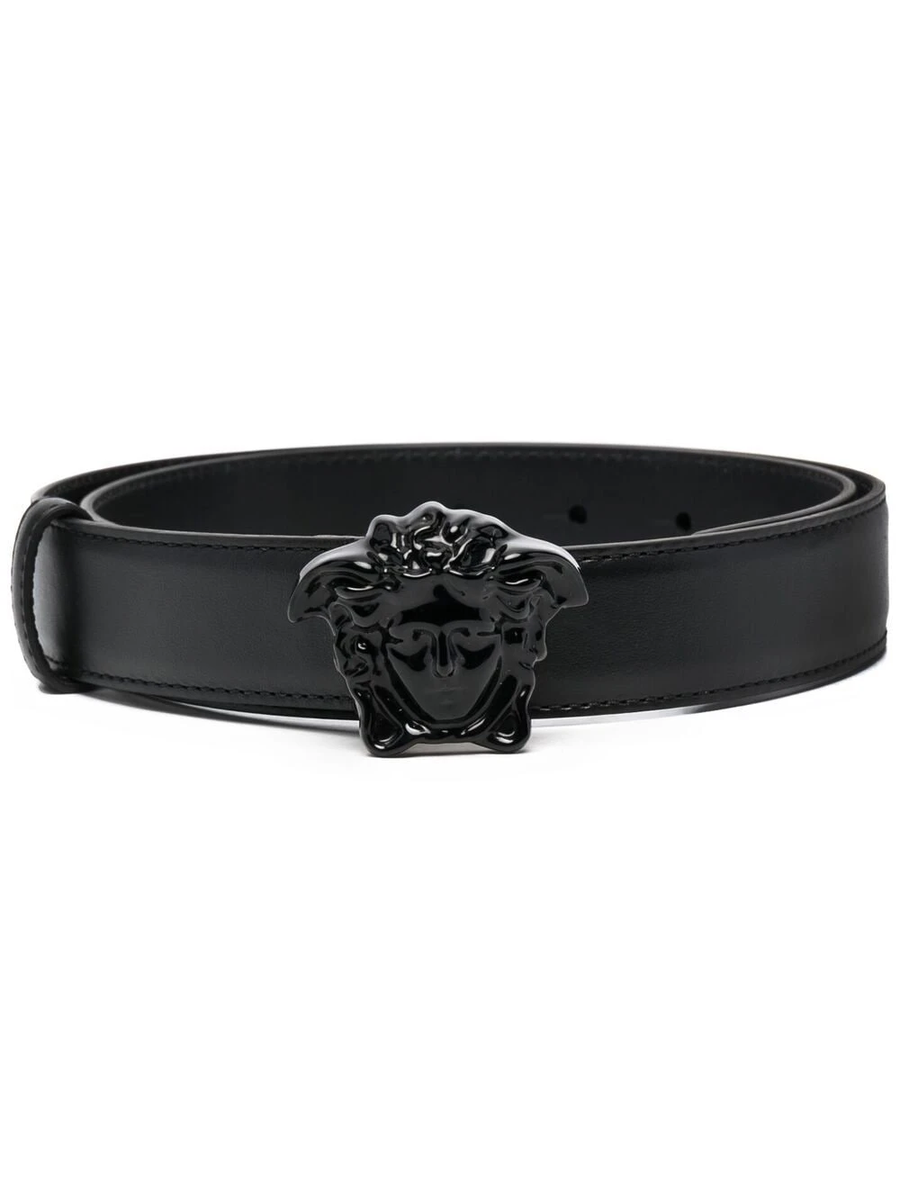 Design ton sur ton, détail Medusa, fermeture à boucle, taille ajustable. Couleur : noir. Matière : cuir.