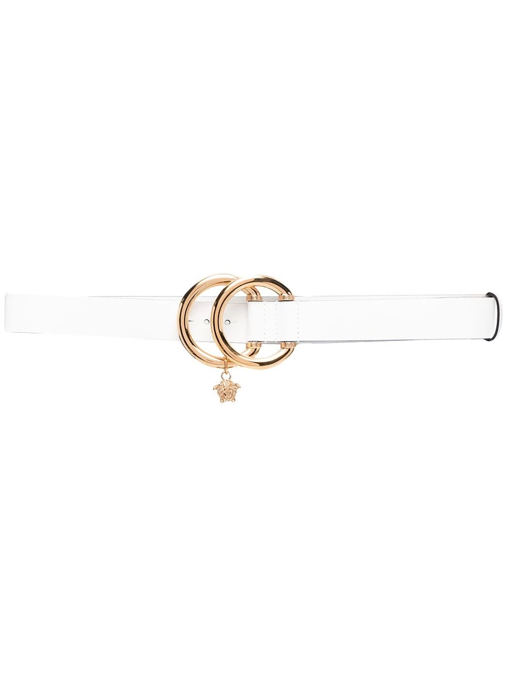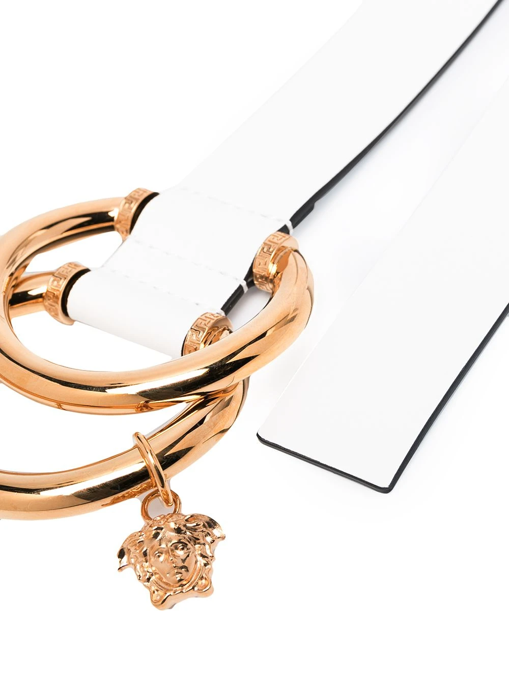 Finitions en métal doré, motif Medusa, fermoir à double boucle, taille ajustable. Matière : cuir.