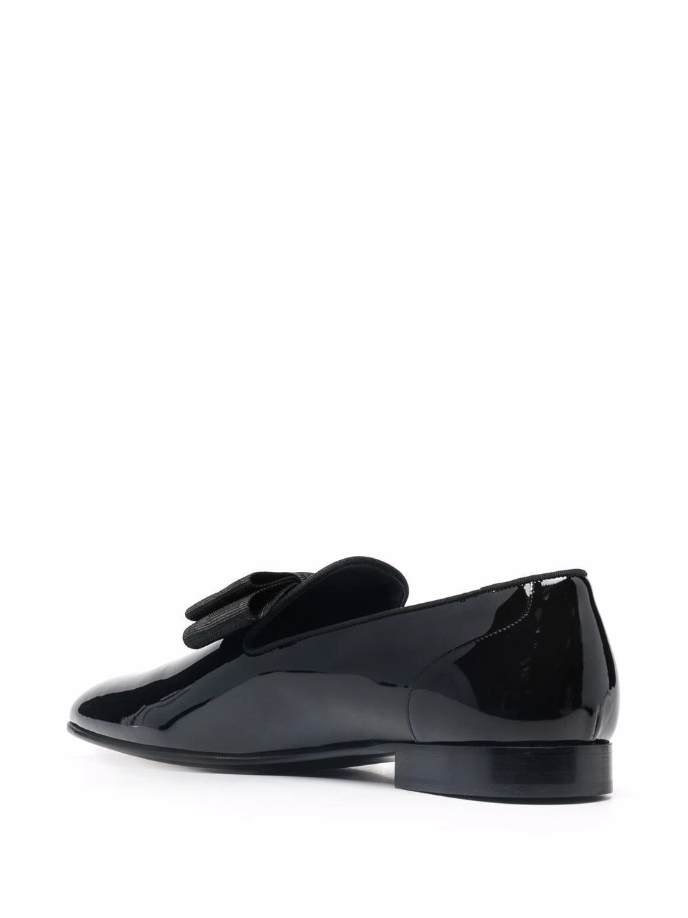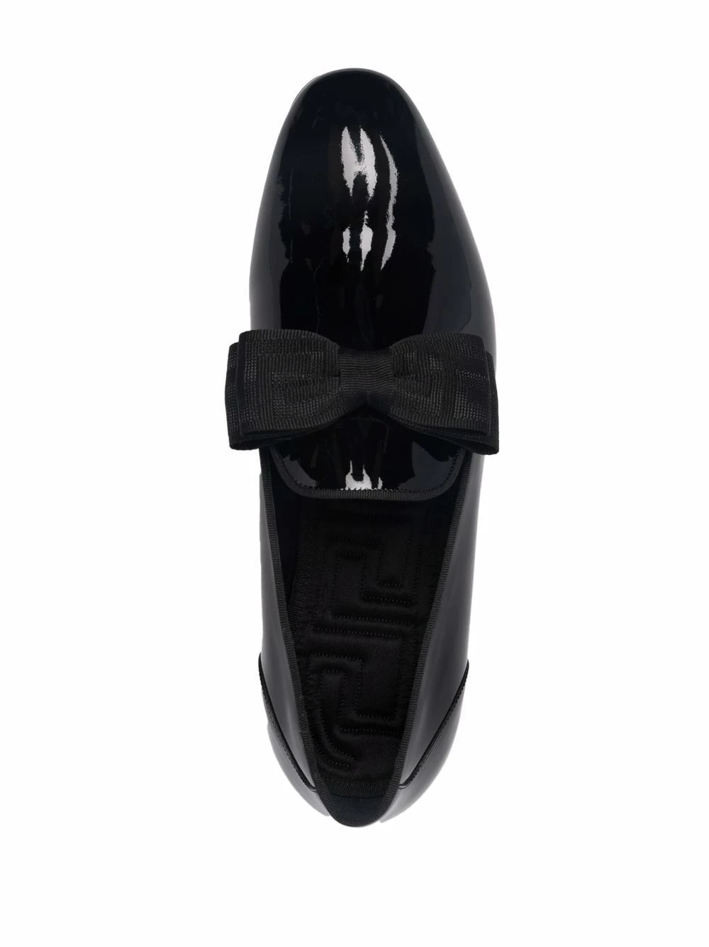 Bout en amande, semelle intérieure à logo, design à enfiler, petit talon bottier, détail de nœud. Matière : cuir verni.