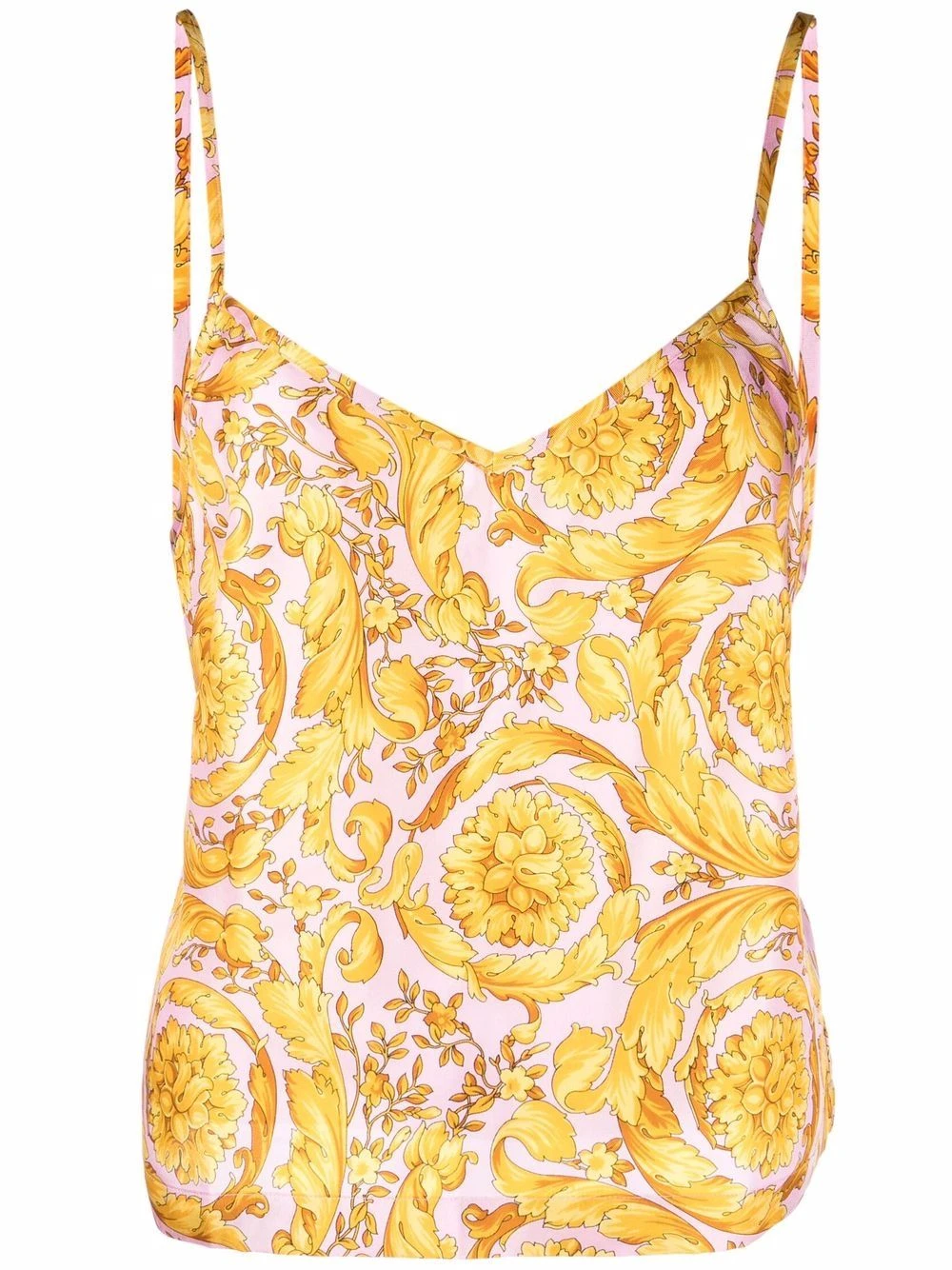 Imprimé Barocco signature, col v, fines bretelles, ourlet droit. Matière : soie.