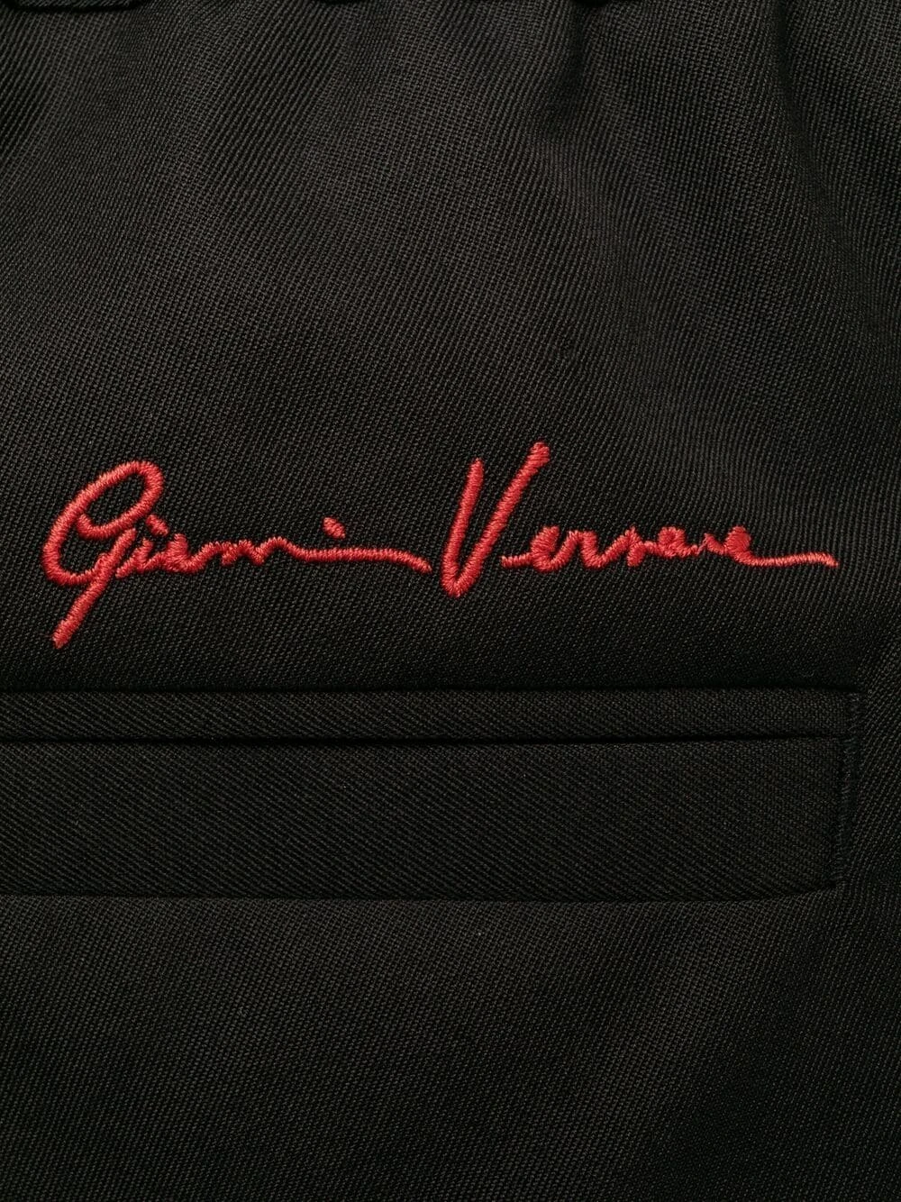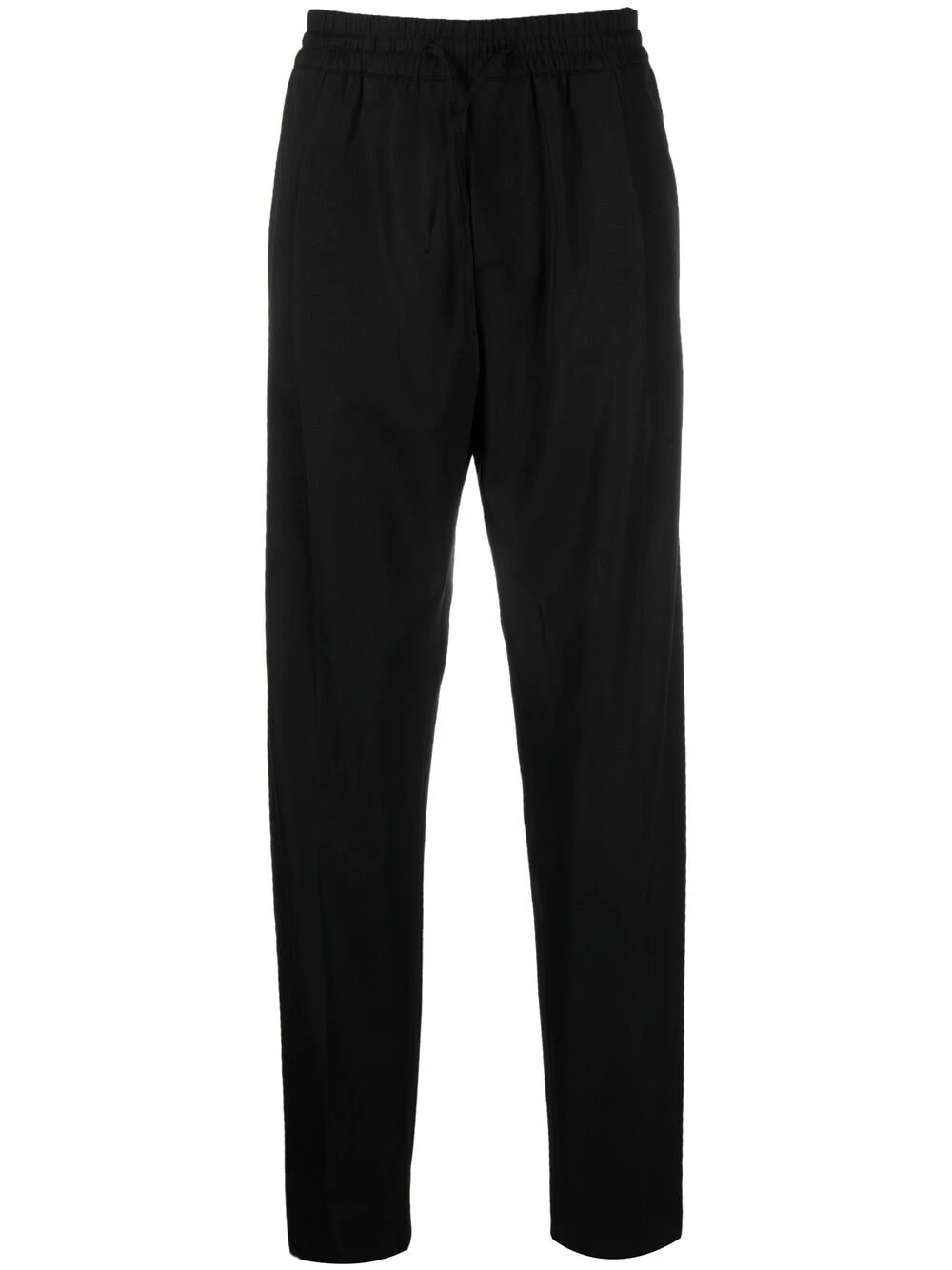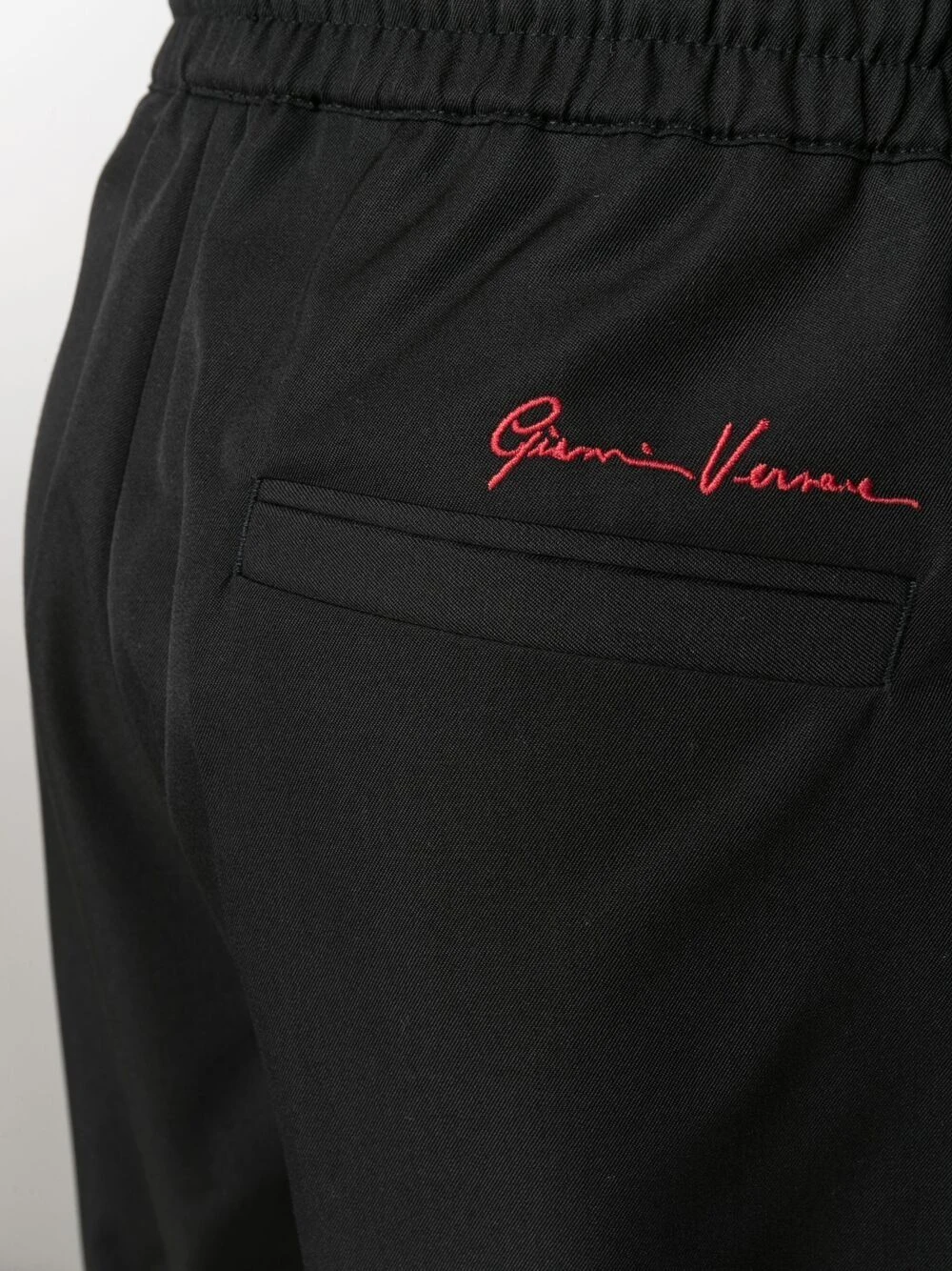 Plis marqués, logo brodé à l’arrière, lien de resserrage à la taille, ceinture élastique, poches latérales fendues, poche arrière passepoilée. Couleur : noir. Matière : laine vierge.