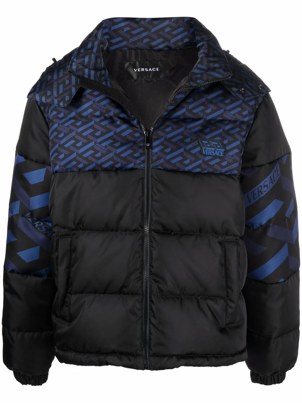 Imprimé monogrammé, design à empiècements, garnissage en duvet, design matelassé, col montant, fermeture zippée devant, manches longues, deux poches passepoilées avant. Matière : coton.