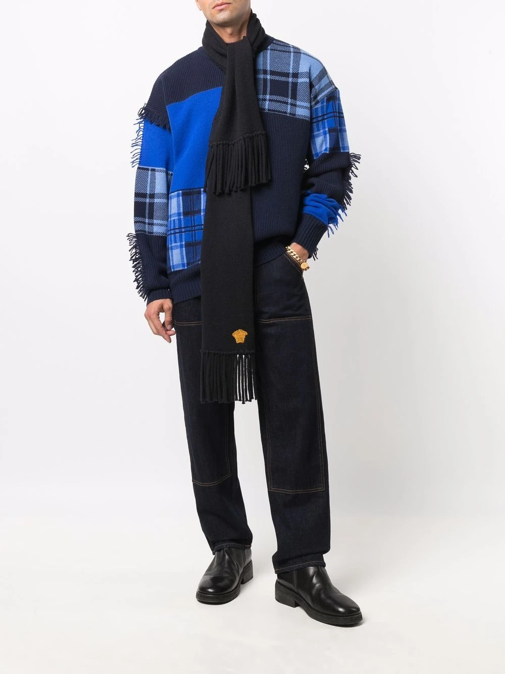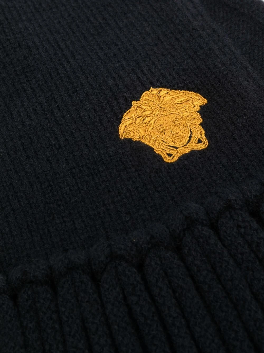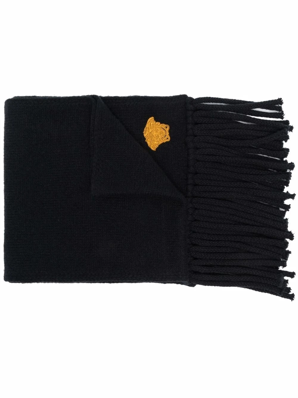 Motif Medusa, broderies, bordure à franges. Couleur : noir. Matière : cachemire.