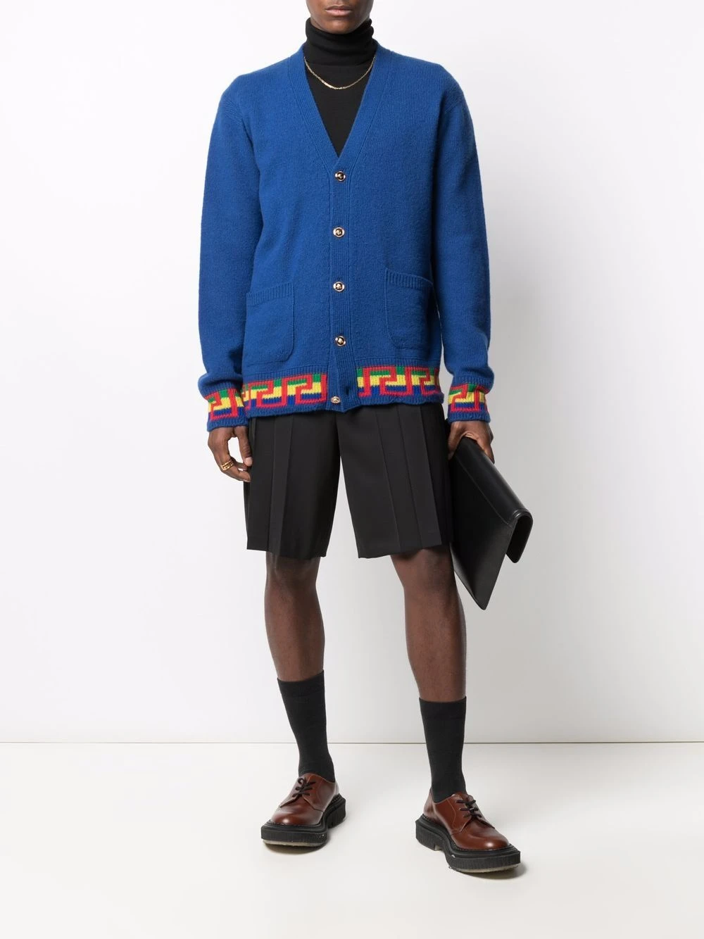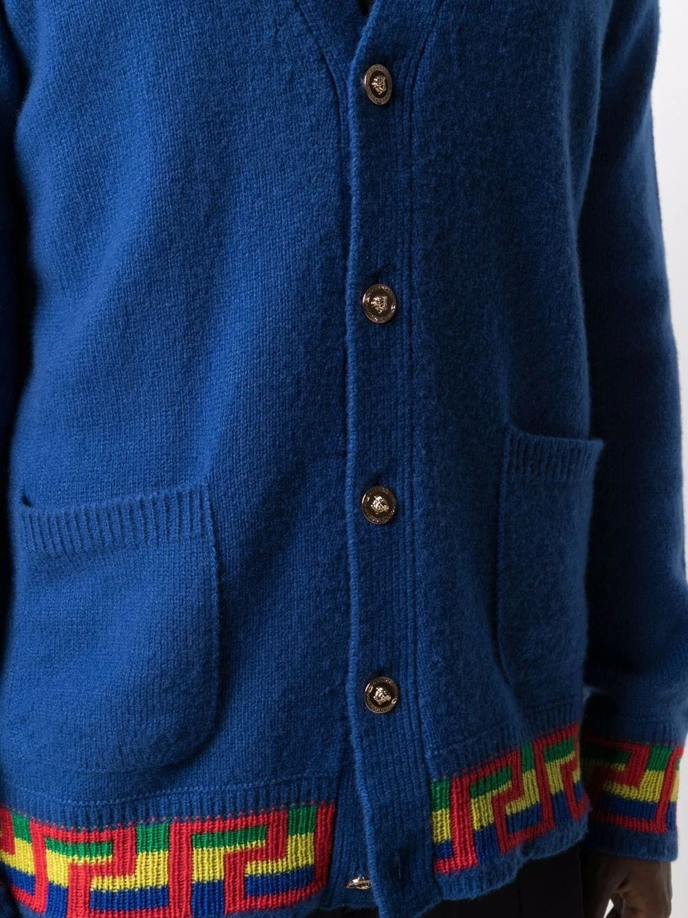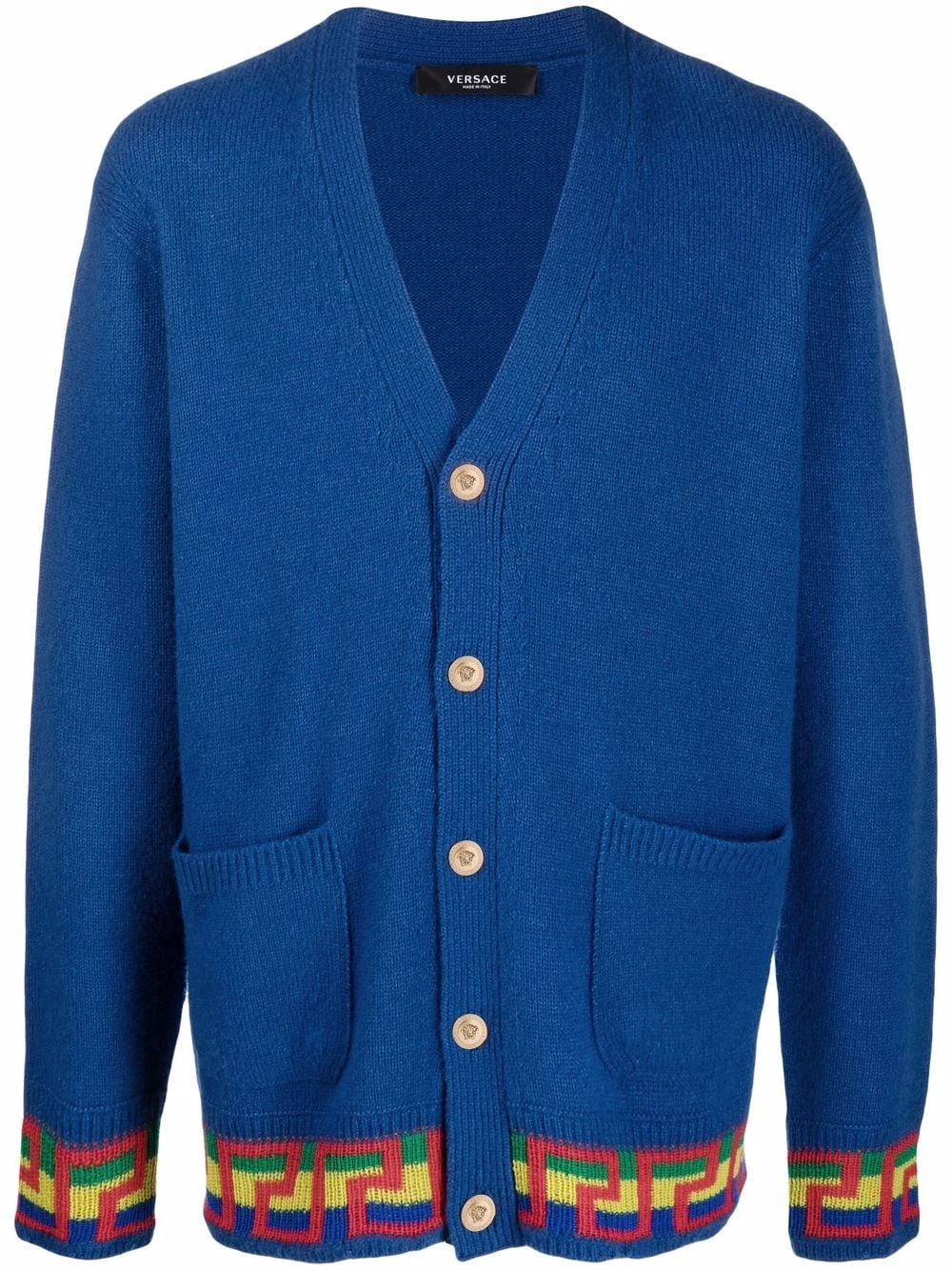 Détail Greca signature, jacquard à motifs, motif Medusa, boutons dorés à détails embossés, design tricoté, col v, effet d’épaules descendues, boutonnière sur le devant, manches longues, deux poches plaquées avant. Couleur : bleu.